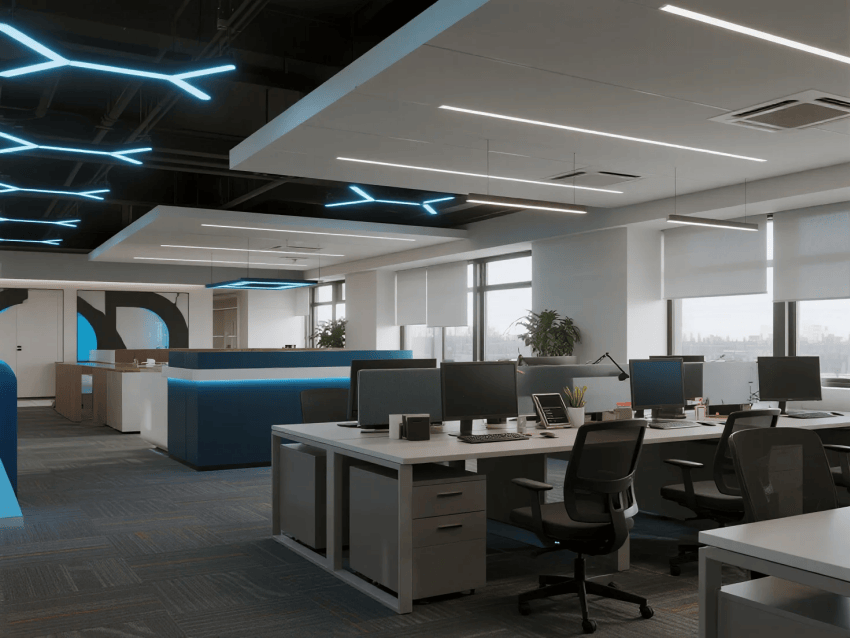 本案以"數(shù)字原生工作生態(tài)"為設(shè)計(jì)理念,打造面向Z世代程序員的終極編碼圣殿。空間采用黑客美學(xué)語言,主色調(diào)為宇宙黑打底,企業(yè)藍(lán)點(diǎn)睛,熒光綠勾勒科技動(dòng)脈。核心區(qū)域突破傳統(tǒng):編程區(qū)設(shè)置光環(huán)境智能調(diào)節(jié)系統(tǒng),走廊變身開源代碼貢獻(xiàn)墻,休息區(qū)配置人體工學(xué)電競艙。