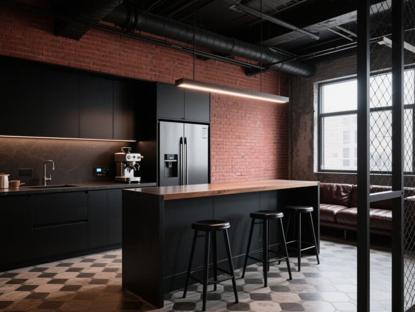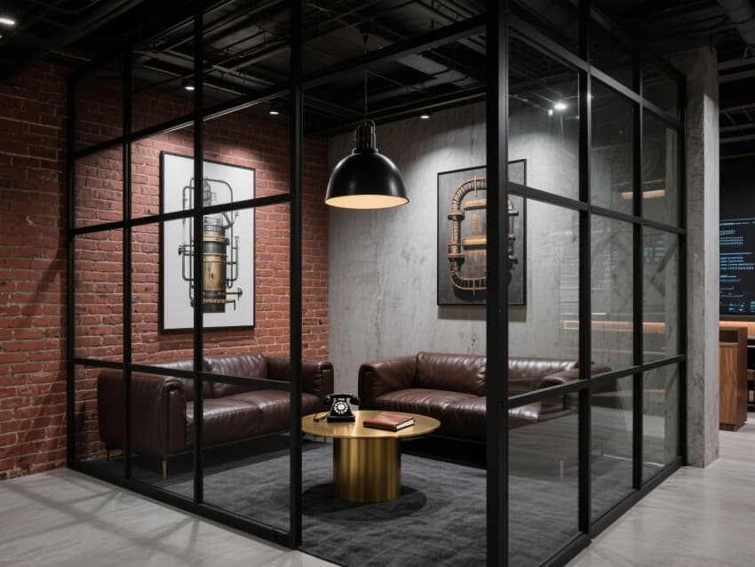 各區(qū)域通過(guò)統(tǒng)一的黃銅收邊與暖調(diào)軌道燈串聯(lián),茶水間配備不銹鋼操作臺(tái)與黑色金屬置物架,走廊懸掛工業(yè)風(fēng)金屬框裝飾畫(huà),角落擺放造型簡(jiǎn)約的綠植盆栽。既保留工業(yè)風(fēng)的粗獷個(gè)性,又以輕奢元素提升空間精致度,打造出適配創(chuàng)意企業(yè)與高端商務(wù)團(tuán)隊(duì)的個(gè)性辦公場(chǎng)景。