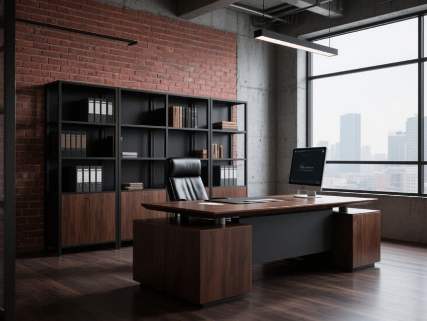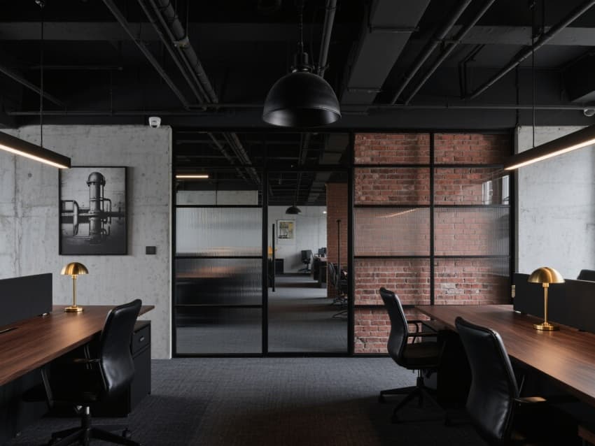 •     以現(xiàn)代工業(yè)風(fēng)與輕奢商務(wù)感融合為核心,構(gòu)建出統(tǒng)一硬朗又精致的辦公空間體系。整體以深灰水泥色與炭黑色為基底,穿插黃銅金屬與胡桃木色作為點(diǎn)綴,通過(guò)裸露的黑色金屬桁架、水泥肌理墻面與利落直線條,凸顯工業(yè)風(fēng)的力量感,同時(shí)用輕奢材質(zhì)平衡商務(wù)場(chǎng)景的專(zhuān)業(yè)度。?