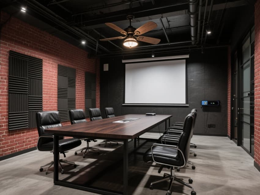 開(kāi)放式辦公區(qū)采用胡桃木飾面的模塊化工位,搭配黑色金屬框架座椅,天花保留原始管線并噴涂啞光黑漆,地面鋪設(shè)做舊復(fù)古地磚;會(huì)議室以雙層鋼化玻璃圍合,墻面嵌入黃銅邊框的電子屏,桌面選用大理石材質(zhì),搭配皮質(zhì)高背會(huì)議椅。接待區(qū)設(shè)置弧形黑色金屬屏風(fēng),背景墻用水泥灰與黃銅線條拼接出企業(yè)LOGO,搭配絨布材質(zhì)的接待沙發(fā),營(yíng)造輕奢質(zhì)感。?