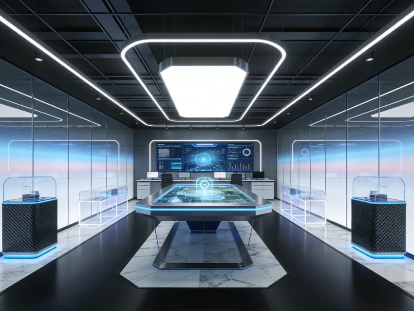 整體以深空灰、科技藍(lán)為主色調(diào),搭配淺灰基底平衡視覺,材質(zhì)選用防靜電地板、隔音環(huán)保板材及磨砂玻璃。墻面局部嵌入數(shù)據(jù)可視化線條與簡約科技元素裝飾,燈光采用分層智能照明系統(tǒng),兼顧專注辦公與氛圍營造。各區(qū)域通過通透隔斷與流暢廊道銜接,既保障研發(fā)、數(shù)據(jù)處理等環(huán)節(jié)的專業(yè)性與私密性,又強(qiáng)化團(tuán)隊(duì)協(xié)作便利性,實(shí)現(xiàn)科技美學(xué)與業(yè)務(wù)功能的深度融合。