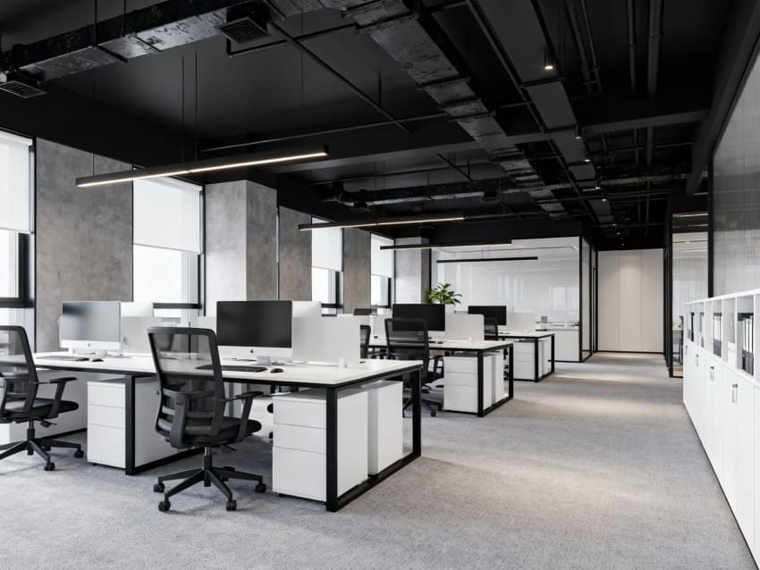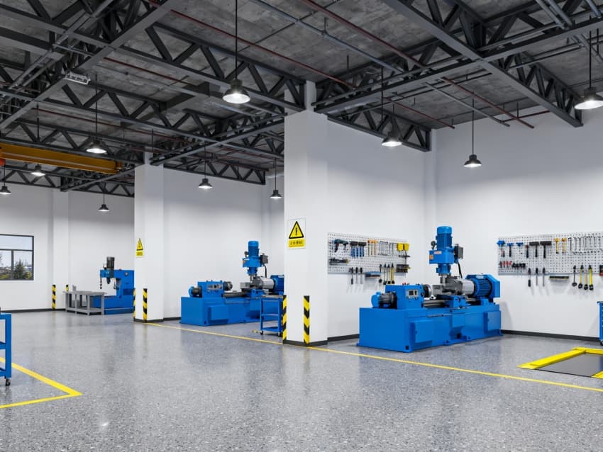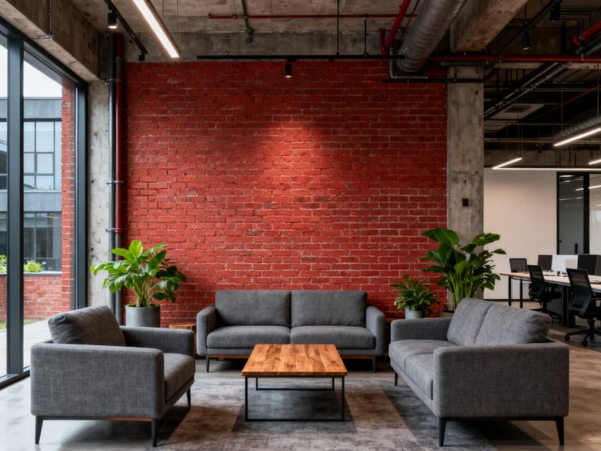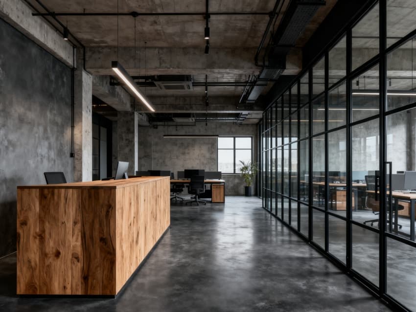 內(nèi)部空間延續(xù)外立面調(diào)性:車間區(qū)鋪深灰防滑耐磨地磚,頂面暴露規(guī)整管線與工業(yè)吊燈,設模塊化承重貨架與設備操作臺,滿足生產(chǎn)需求;辦公區(qū)銜接車間設計,用淺灰地毯與白色吸音吊頂,搭配實木與金屬結(jié)合的辦公家具,弱化工業(yè)冷感;接待區(qū)設水泥肌理前臺,搭配深灰皮質(zhì)沙發(fā);茶水間用不銹鋼臺面與淺灰柜體,適配工業(yè)場景耐用性;走廊鋪淺灰地膠,墻面嵌工業(yè)風導視牌。整體以深灰、淺灰、原木色為基調(diào),通過材質(zhì)呼應,打造生產(chǎn)與辦公融合的專業(yè)空間。