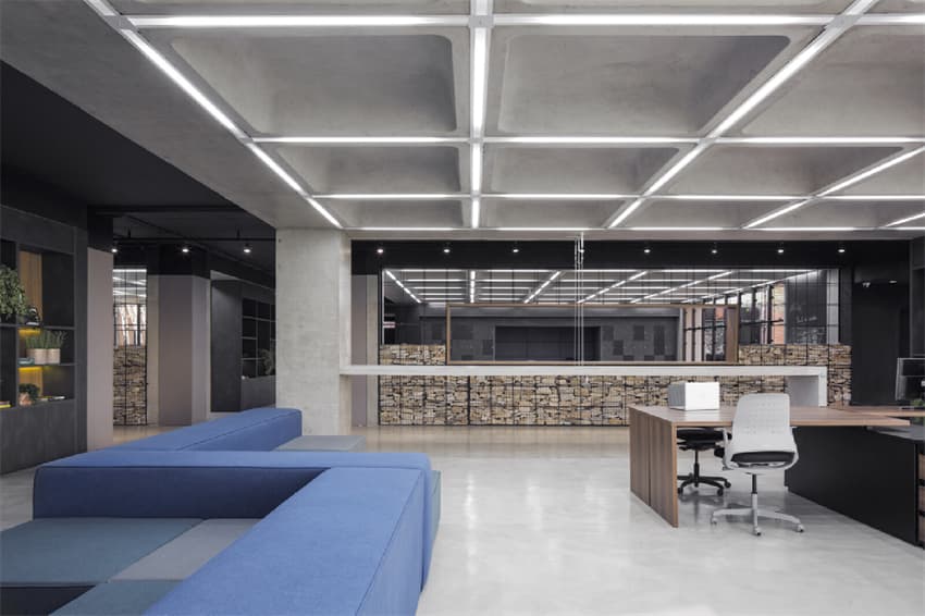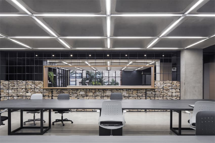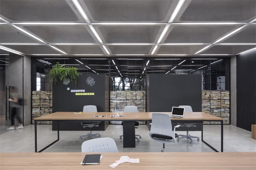 在石籠的南側(cè),行政部門是一個(gè)開放空間,由一組相互連接的桌子組成,該設(shè)計(jì)旨在提供一個(gè)不太嚴(yán)格的布局,另一側(cè)分別放置在會議室和會議室。這些空間由淺色和深色木板混合而成。整個(gè)南部區(qū)域是相連的,分隔這些房間的門可以打開和嵌入,它們顯示出空間之間的流動,還由建筑師設(shè)計(jì)的模塊化沙發(fā)組合,將整個(gè)區(qū)域轉(zhuǎn)變?yōu)橐粋€(gè)可能的休息室,用于活動或指示。