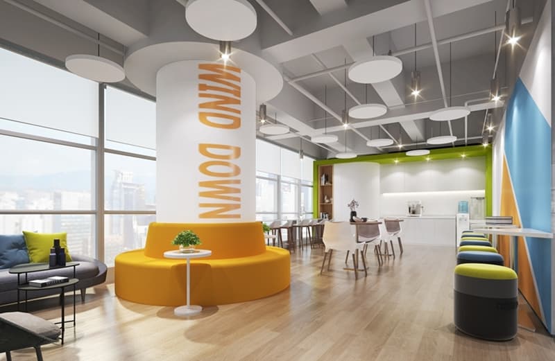 設計分析抓住主題與元素,此次辦公室裝修有很多精彩的細節(jié),比如從LOGO中延伸出來的綠色覆蓋了整個辦公室,結合家具年輕搶眼的色彩,空間變得十分活躍。為了打破規(guī)規(guī)矩矩的沉悶感,設計師用到了各種線條元素,如前臺的斜面,休閑區(qū)吊頂上的圓形裝飾,前廳一側的“綠盒子”洽談區(qū),文印區(qū)也是一個盒子造型。