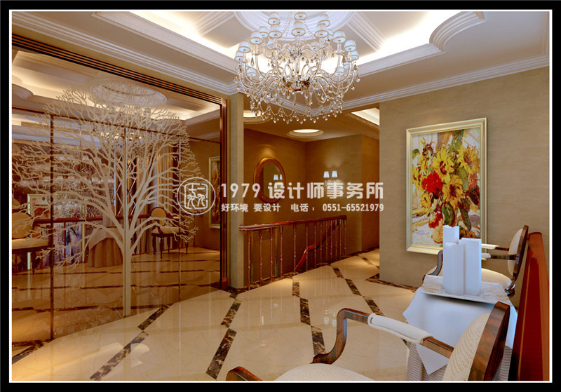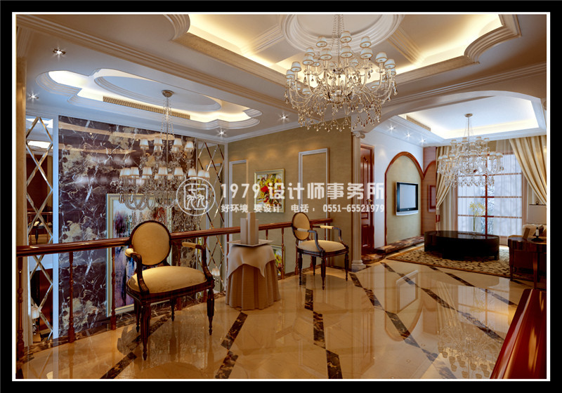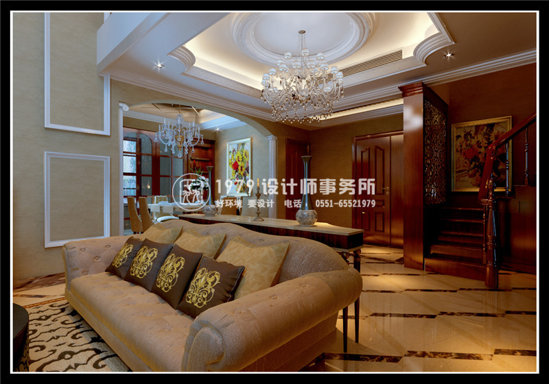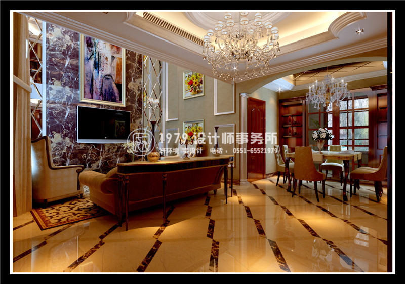 設(shè)計(jì)簡介:客廳背景墻以低調(diào)的深色大理石和茶鏡結(jié)合,營造濃烈的意識氛圍。墻面用優(yōu)質(zhì)乳膠漆,頂部用用華麗的水晶吊燈營造氣氛。地面材料以黑白相間的大理石為主。布藝沙發(fā)組合有著絲絨的質(zhì)感以及流暢的木質(zhì)曲線,將傳統(tǒng)歐式家居的奢華與現(xiàn)代家居的實(shí)用性完美地結(jié)合。壁燈自然不可或缺,它被安置在空間的交匯處,給敞開式的客廳提供了一個(gè)新的亮點(diǎn)。