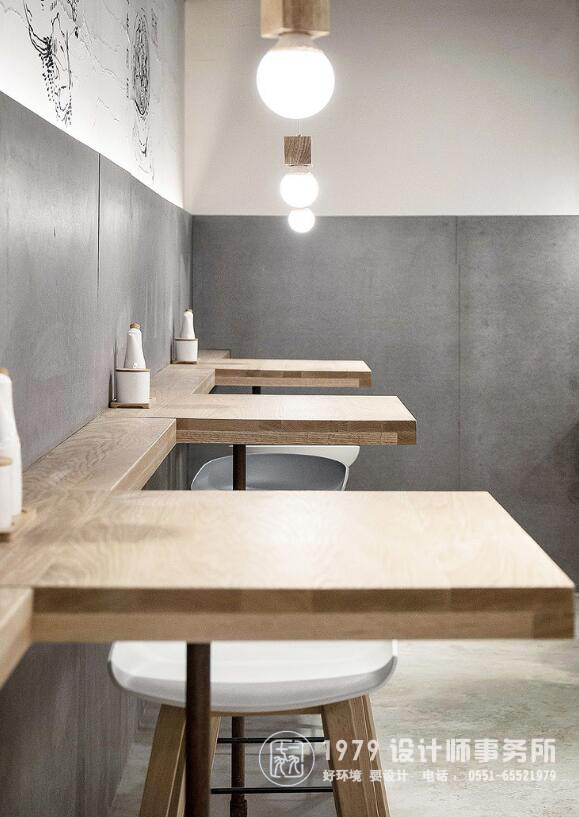專心吃一碗面 Enjoying a bowl of noodles 兩側(cè)高吧臺(tái)順著墻體流線排布,高效簡(jiǎn)單。在我們固有的概念里,對(duì)著墻壁吃面不免局促孤單,而這正是店主與設(shè)計(jì)師想傳達(dá)的理念“專心吃好一碗面”,對(duì)著水泥墻面,吊著一盞溫暖小燈,照亮眼前一碗香氣四溢的面,此刻心里的念頭就是享受這碗面帶來(lái)的滿足。