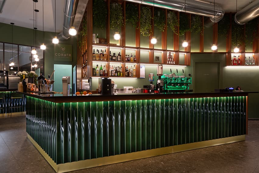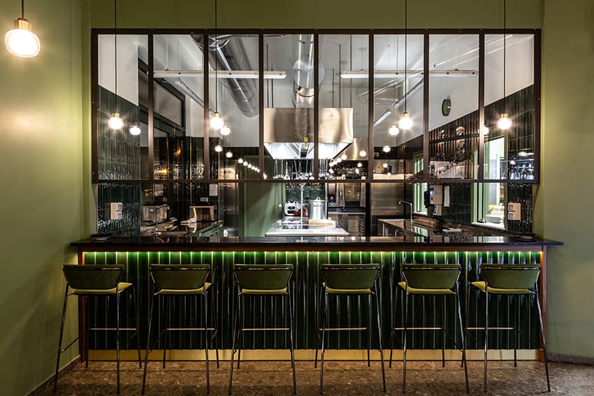 該項目從北歐色彩和海外靈感出發(fā),提出了其他看到和體驗過的地方的圖像。綠色,是童年、春天和幸運的顏色,就像一個舒適、封閉的室內裝飾。舒適的街角酒吧,在每個城市眨眼,邀請你停下腳步。這刻意與城市外部綠樹成蔭的環(huán)境對話,常常擠滿了大窗戶。大橄欖樹的神奇之處在于,它將樹枝伸向林蔭道的樹木,仿佛要抹去內外之間的界限。干預措施押注于復興城市中一個常常被遺忘的美麗地方。