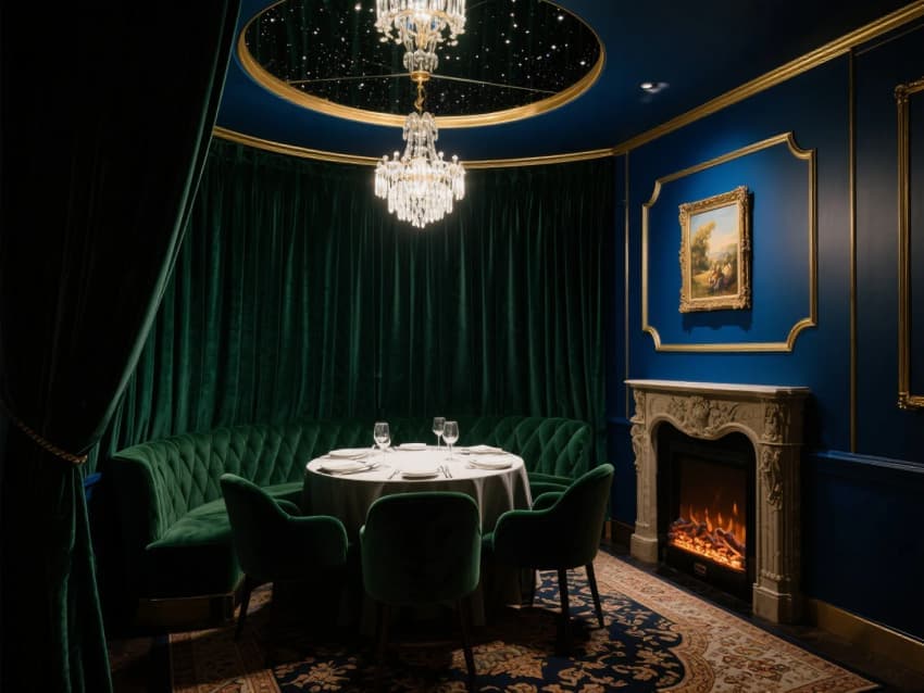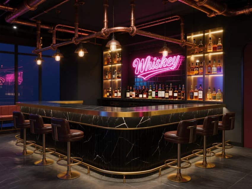 設(shè)計(jì)以粗獷與精致碰撞為基調(diào),保留原始建筑的紅磚墻、鋼結(jié)構(gòu)與木質(zhì)橫梁,搭配黃銅燈具和復(fù)古皮革卡座,營造懷舊工業(yè)風(fēng)。中央挑空區(qū)植入垂直森林,懸掛綠植與透明天窗引入自然光影。開放式廚房以黑色巖板+銅色金屬打造視覺焦點(diǎn),吧臺(tái)區(qū)配置霓虹燈牌與精釀銅管系統(tǒng),增添潮流活力。地面采用水磨石拼接深色木地板,劃分不同用餐區(qū)。私密包廂以絲絨簾幕和藝術(shù)玻璃隔斷營造低調(diào)奢華感,整體空間在粗糲中透出現(xiàn)代精致,打造“都市綠洲”般的用餐體驗(yàn)。
