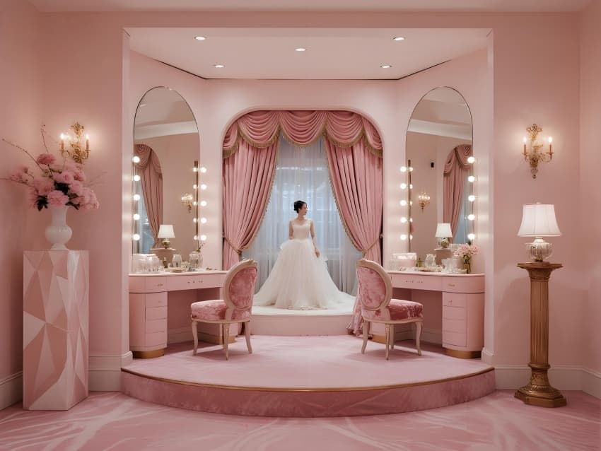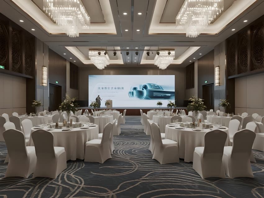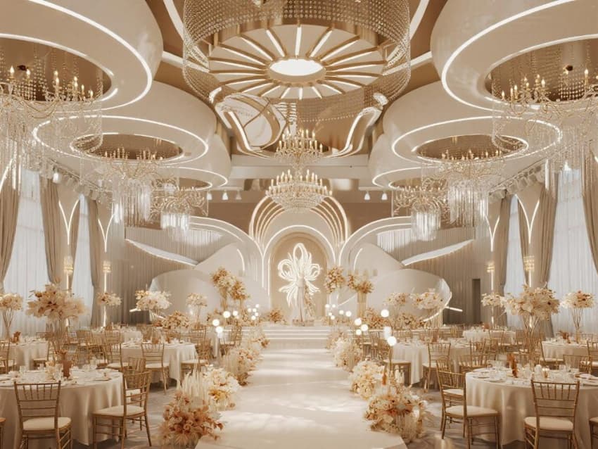 材質(zhì)精選施華洛世奇水晶、意大利絲絨、智能調(diào)光玻璃,所有設(shè)計服務(wù)于沉浸式儀式體驗(yàn)。幾何造型的懸浮舞臺與流體藝術(shù)裝置形成剛?cè)釋Ρ龋罱K呈現(xiàn)一個既如童話般夢幻又能承載真摯情感的婚禮圣殿。
