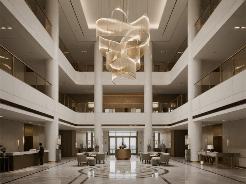 本案以"永恒的浪漫方程式"為設(shè)計主題,打造可定制的夢幻婚禮宇宙??臻g采用高級定制造型,主色調(diào)演繹愛情光譜:珍珠白基底象征純潔,玫瑰金流動線條隱喻甜蜜,香檳色水晶燈群營造奢華質(zhì)感。智能系統(tǒng)實(shí)現(xiàn)場景魔法:星空頂隨流程變換星座,智能桌花自動開合,全息幕墻播放愛情電影。
