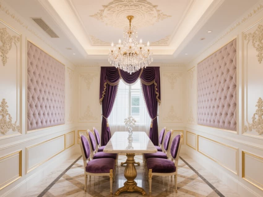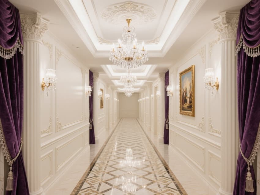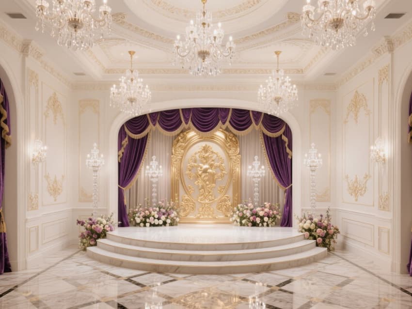 以新古典奢華風(fēng)格為核心,構(gòu)建起統(tǒng)一的典雅莊重空間美學(xué)。整體以珍珠白為基底,搭配鎏金線條與深咖色軟裝,穹頂懸掛多層水晶吊燈,光影透過(guò)浮雕石膏線在墻面形成錯(cuò)落有致的紋路。?