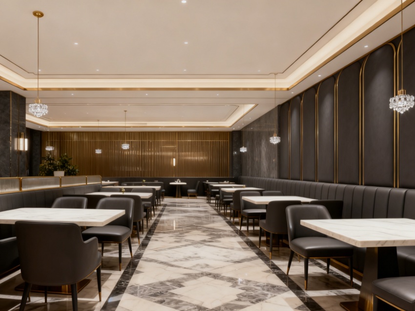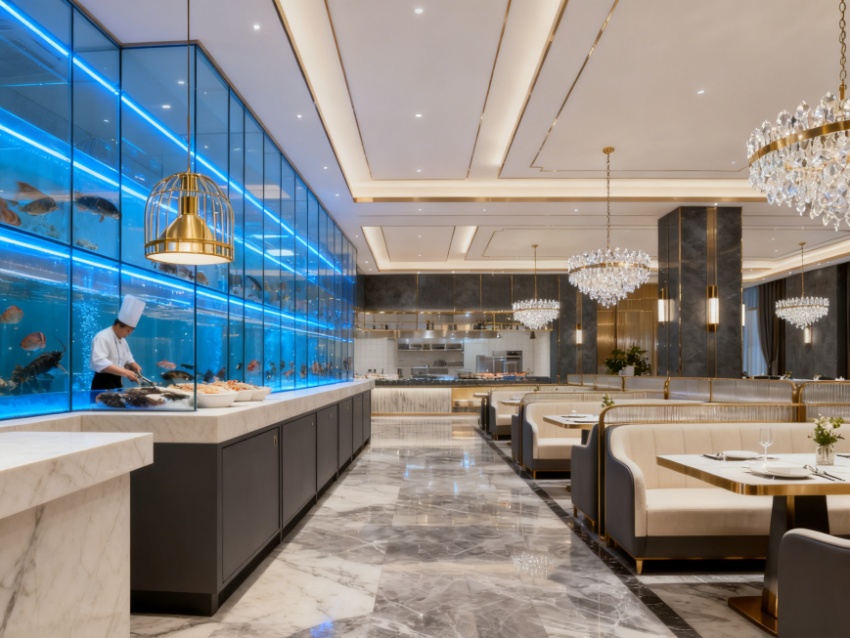 整體設(shè)計(jì)以深海藍(lán)、淺金、米白為主色調(diào),搭配金屬質(zhì)感裝飾與海洋元素軟裝——墻面嵌入貝殼紋理飾面板,天花板懸掛海浪造型吊燈,餐臺(tái)搭配玻璃擋邊與冰鮮陳列,強(qiáng)化主題氛圍。1800㎡空間內(nèi)通過(guò)材質(zhì)對(duì)比提升質(zhì)感,地面采用防滑耐磨的仿石磚,卡座運(yùn)用皮革軟包,局部綠植點(diǎn)綴緩解視覺(jué)疲勞。燈光設(shè)計(jì)兼顧實(shí)用性與氛圍感,餐臺(tái)區(qū)域高亮照明突出食材新鮮,用餐區(qū)暖光營(yíng)造溫馨氛圍,實(shí)現(xiàn)味覺(jué)與視覺(jué)的雙重享受。