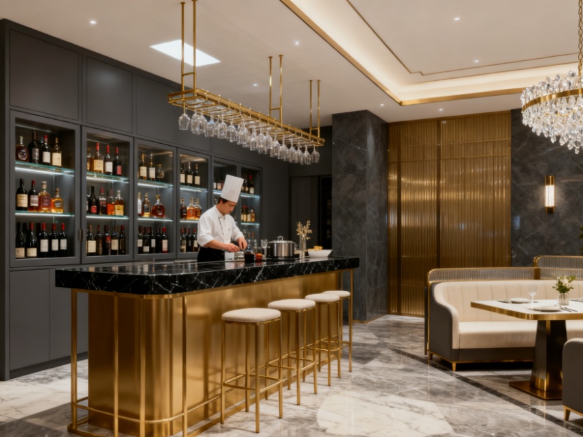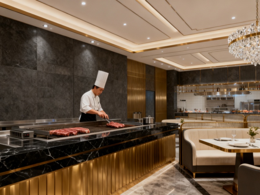 內(nèi)部空間遵循“分區(qū)清晰、動(dòng)線流暢”原則,科學(xué)規(guī)劃海鮮刺身區(qū)、牛排現(xiàn)煎區(qū)、熱菜區(qū)、甜品區(qū)、飲品區(qū)及用餐區(qū)。核心餐臺(tái)采用中島式布局,環(huán)形動(dòng)線方便食客取餐;用餐區(qū)分為散座區(qū)、卡座區(qū)與私密包間,滿足不同用餐場(chǎng)景需求。?