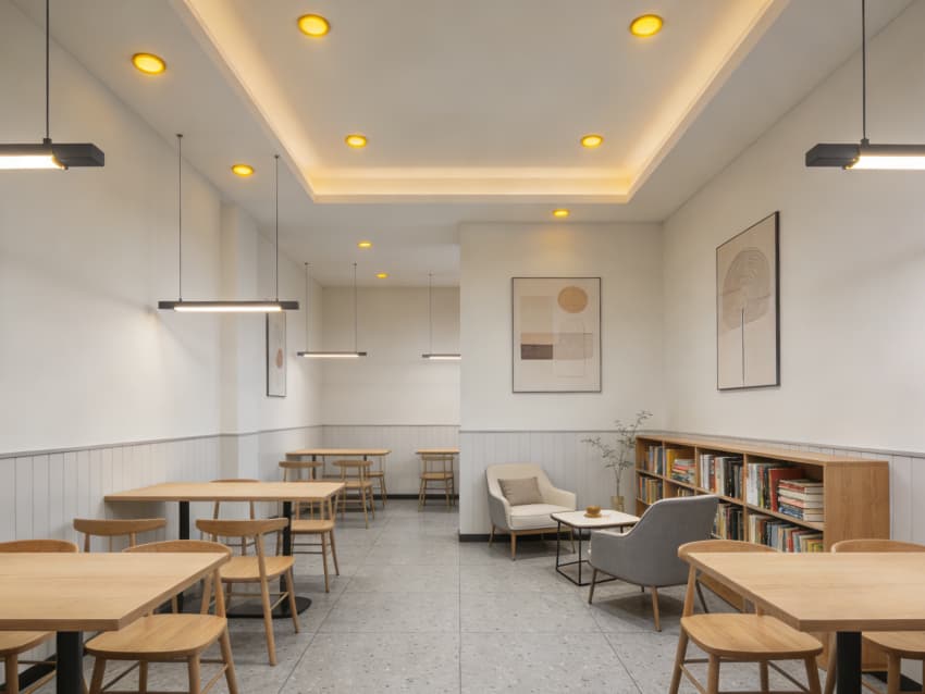 明檔廚房采用玻璃隔斷設(shè)計(jì),將烹飪過(guò)程可視化,既增強(qiáng)顧客信任感,又通過(guò)煙火氣提升空間活力;旁側(cè)的休閑閱讀區(qū)以書(shū)架 + 軟椅打造等候場(chǎng)景,延伸了空間功能,有效提升顧客停留時(shí)長(zhǎng)。
