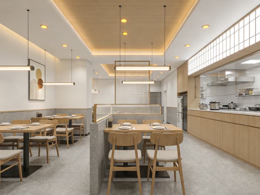 整體空間采用簡(jiǎn)約原木風(fēng)設(shè)計(jì)語(yǔ)言,以淺橡木、米灰色為基底,搭配暖橙色燈光與軟質(zhì)軟裝,營(yíng)造出溫暖松弛的氛圍。頂面層次分明的燈光系統(tǒng)是空間的點(diǎn)睛之筆:嵌入式筒燈保障基礎(chǔ)照度,線(xiàn)性吊燈勾勒空間縱深感,卡座下方的氛圍燈帶則強(qiáng)化了私密感與舒適感,暖調(diào)光線(xiàn)既提升食欲,又讓用餐場(chǎng)景更具治愈感。
