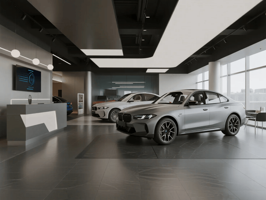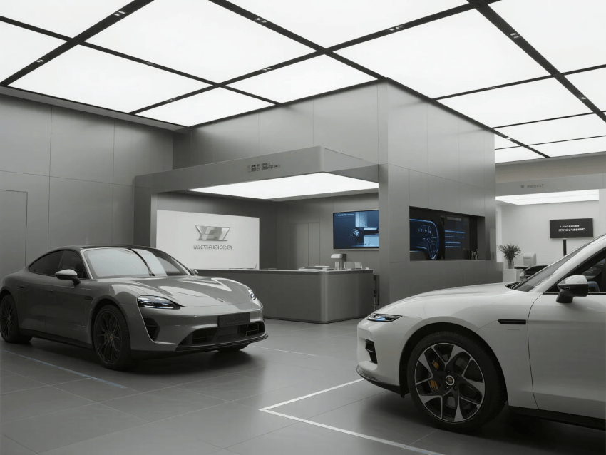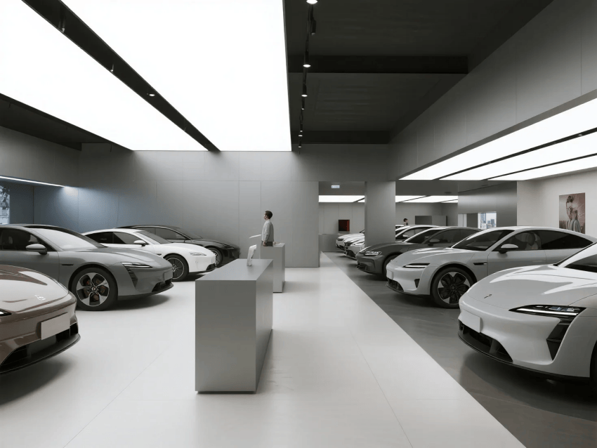 展廳以"機械藝術(shù)×人文奢享"為核心理念,采用工業(yè)美學與輕奢主義的跨界融合。空間以鈦空灰為主基調(diào),搭配香檳金與深海藍跳色,材質(zhì)上運用航空鋁、意大利洞石與防眩目超白玻構(gòu)建高級質(zhì)感。設計突破傳統(tǒng)4S店模式,通過"博物館式展陳+私人會所服務"的雙動線布局,將科技體驗(如全息引擎拆解秀)與人文細節(jié)(手工皮具展示墻)完美結(jié)合。燈光采用博物館級軌道射燈與可變色溫線性光源,精準控制不同車型的戲劇化呈現(xiàn)。特別設置"聲學優(yōu)化區(qū)"模擬引擎轟鳴,同時通過智能霧化玻璃實現(xiàn)展車模式的瞬間切換。整體既彰顯機械精密之美,又營造出頂級社交空間的尊貴感,重新定義高端汽車零售體驗。