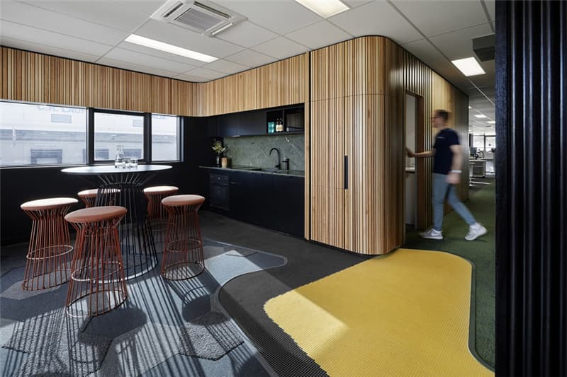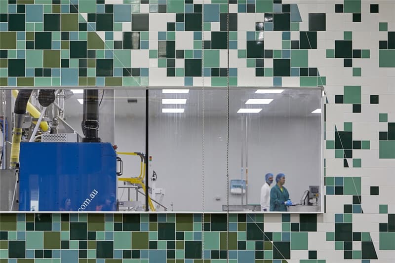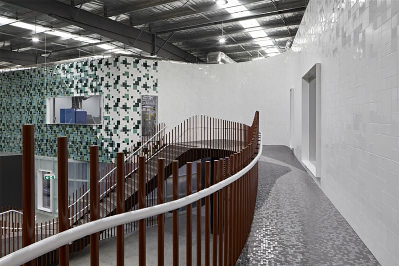 多彩的線條從附近的自然保護區(qū)一直延伸到位于生產區(qū)核心地帶的巨型壁畫上,吸引著員工和參觀工廠的訪客。產自本地的澳洲硬木和紋理豐富的墻面從外部景觀“流進”室內,在自然光線的配合下營造出富有生機的氛圍。