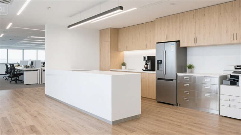 開放式辦公區(qū)以可升降桌、協(xié)作島與高吧臺休憩區(qū)構建靈活場景,穿孔吸音天花與淺木紋PVC地板弱化工業(yè)冷感;獨立辦公室通過灰玻隔斷與胡桃木家具平衡隱私與通透感。公共支持區(qū)、標準會議室等空間,均以啞光金屬、淺灰肌理漆等統(tǒng)一材質串聯(lián),配合3500K色溫燈光,形成連貫的視覺呼吸節(jié)奏。