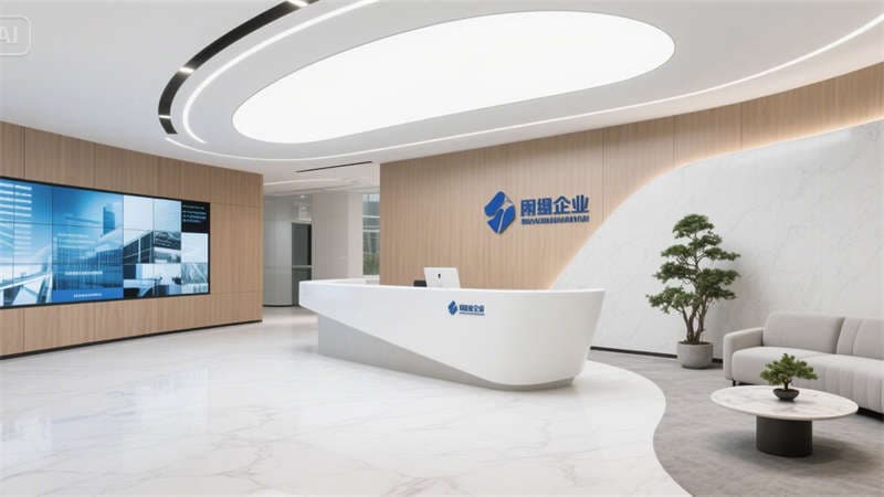建筑外立面以流線型玻璃幕墻與啞光金屬線條勾勒科技輪廓,底部垂直綠植墻與光伏玻璃的融合,將生態(tài)可持續(xù)理念嵌入第一視覺印象。通透的挑高入口與室內大堂形成光影聯(lián)動,淺白色大理石地面、懸浮式線性燈光與深藍色企業(yè)LOGO墻,以克制的色彩系統(tǒng)傳遞品牌調性,同時通過數字屏顯墻實現(xiàn)空間敘事動態(tài)化。