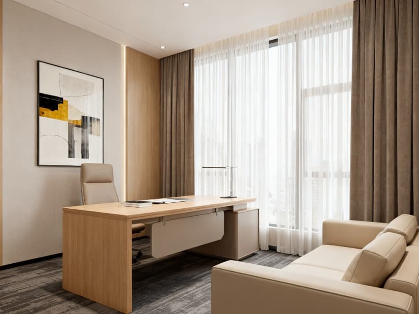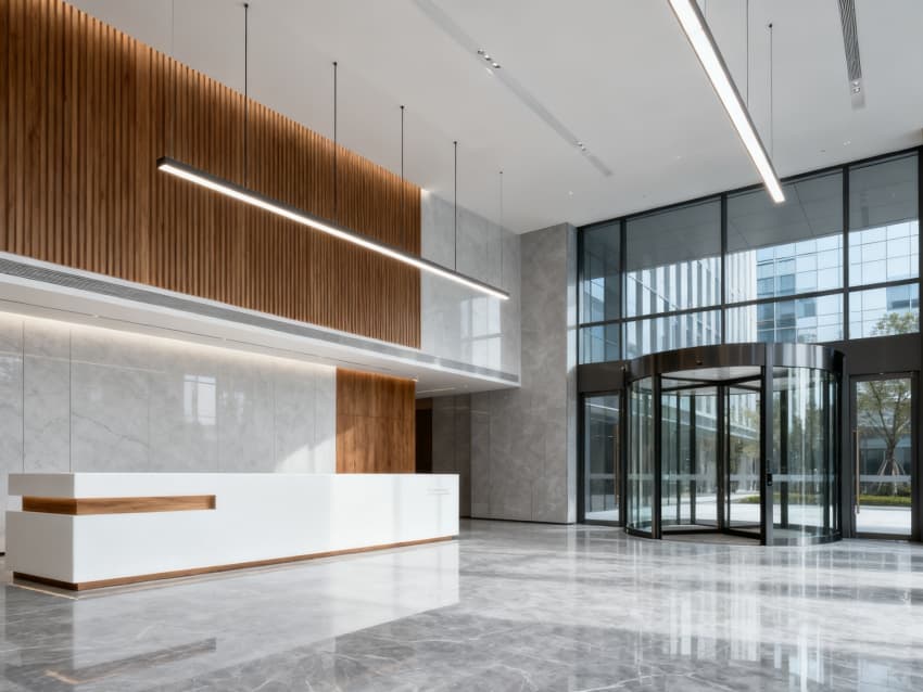 走進辦公樓,里面的裝修風(fēng)格和外面一樣簡約:辦公區(qū)鋪著淺灰色地磚,放著白色辦公桌,淺木色的隔斷讓環(huán)境更溫馨;會議室墻面和吊頂都是淺灰色和白色,嵌入式的燈光讓屋子顯得更整潔;接待區(qū)擺著淺灰色布藝沙發(fā)和白色茶幾,再擺上幾盆綠植,瞬間有了生氣;走廊鋪著淺灰色地磚,墻面刷白,頂上裝的長條燈帶讓走廊顯得又長又寬敞;茶水間的柜子是淺木色的,臺面是白色的,簡單又好用。整個辦公樓從里到外,顏色和材料搭配得很和諧,讓人辦公既舒服又有效率。