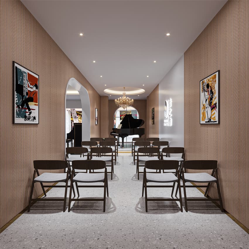 在本案空間中,我們力圖打造一個(gè)富有藝術(shù)氣息,明快簡潔的空間。整體空間我們選用舒適的木制色調(diào)以及親和力較好的材料,并搭配一些突出品牌形象感的色系,運(yùn)用當(dāng)下較為流行的裝修材料來表達(dá),著力體現(xiàn)其溫馨的音樂表演空間。