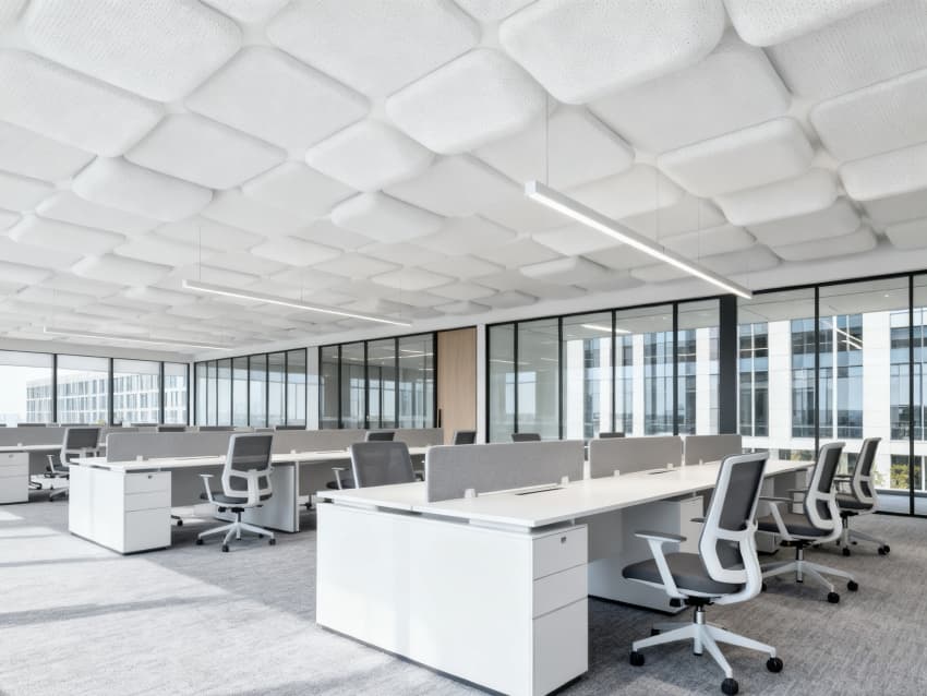 整體以淺灰、白色、淺木色為基調(diào),通過(guò)統(tǒng)一材質(zhì)(金屬線條、玻璃、環(huán)保板材)貫穿空間,局部融入綠植元素,既避免功能分區(qū)的視覺(jué)割裂,又讓3300平空間兼具高效辦公屬性與生態(tài)舒適度,適配園區(qū)中小型企業(yè)的發(fā)展定位。
