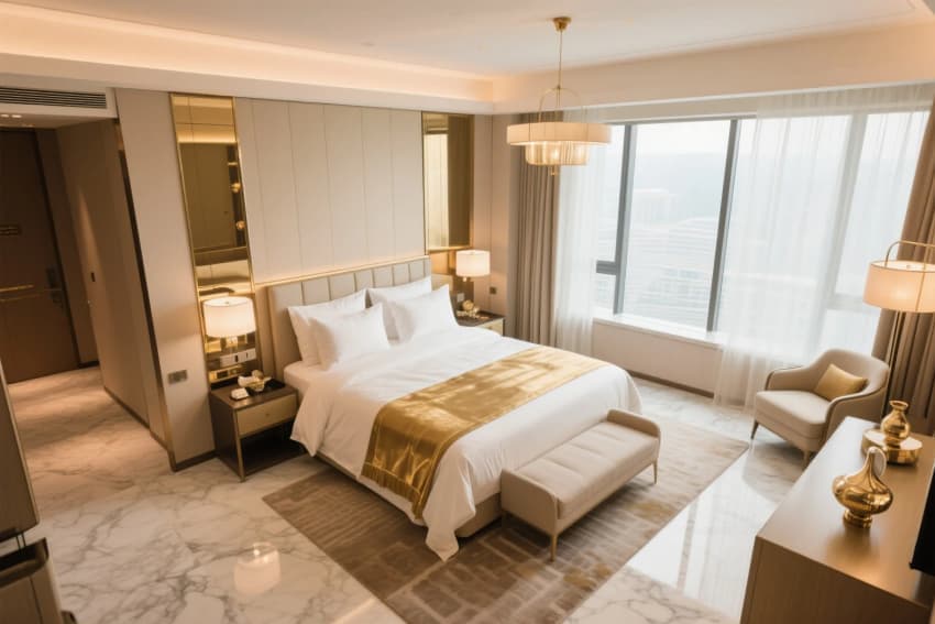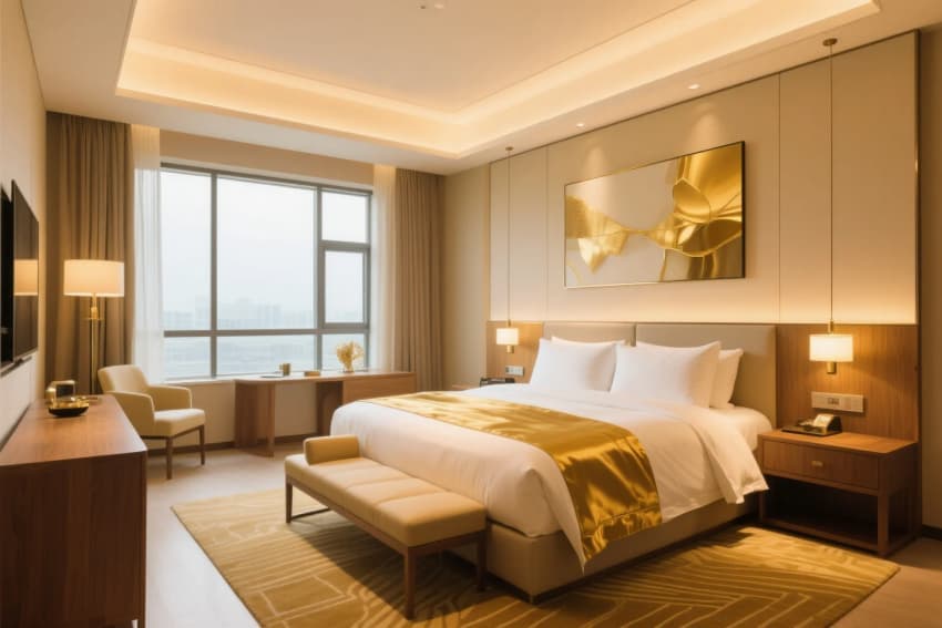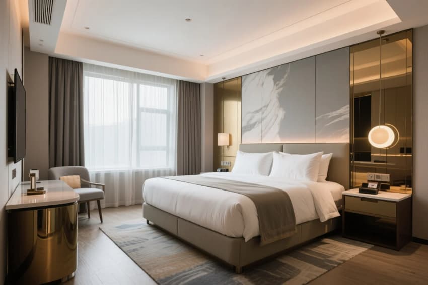 本案以“城市綠洲”為核心理念,采用自然共生型現(xiàn)代風(fēng)格,通過材質(zhì)碰撞與流動線條消解酒店標準化空間的冰冷感。建筑語言上,大量運用弧形墻體與通高玻璃幕墻,將室外景觀轉(zhuǎn)化為動態(tài)藝術(shù)畫作;色彩體系以大地色系為基底,公共區(qū)域通過香檳金金屬飾面提升奢華度,私密空間則采用微水泥與橡木飾面營造溫潤質(zhì)感。