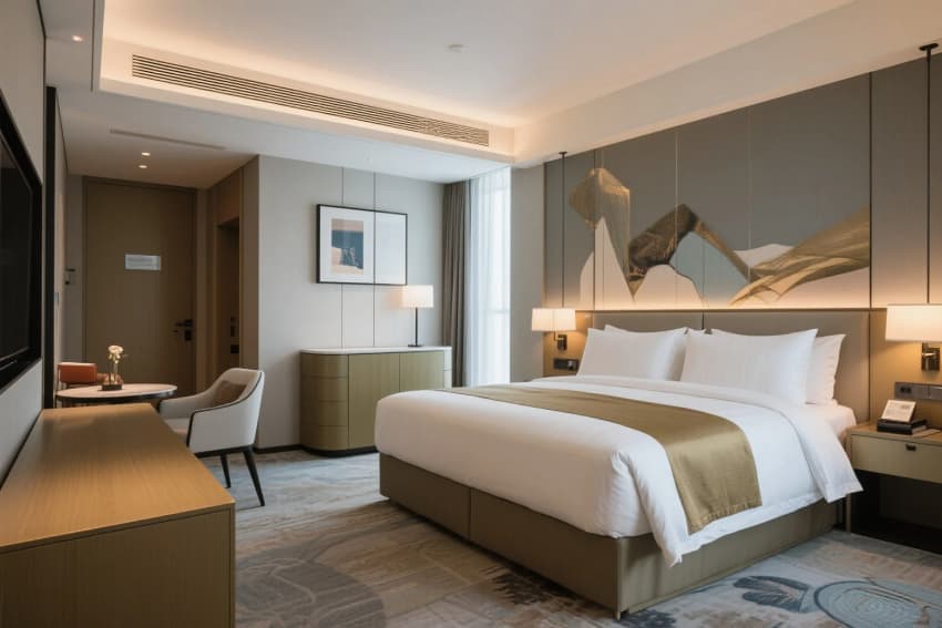 軟裝設(shè)計強調(diào)在地文化表達,例如大堂的藝術(shù)裝置以本地傳統(tǒng)工藝為靈感抽象重構(gòu),客房內(nèi)定制地毯紋樣提取自區(qū)域地貌輪廓。智能系統(tǒng)與設(shè)計美學(xué)深度結(jié)合:隱藏式觸控面板、動態(tài)光域調(diào)節(jié)等技術(shù)均融入裝飾細節(jié)。