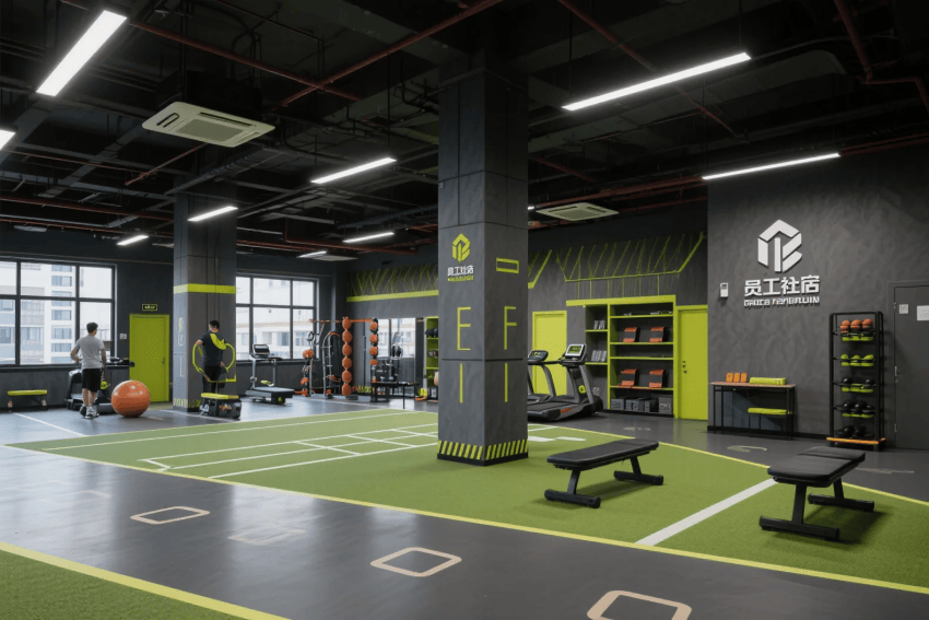 本方案以企業(yè)標(biāo)準(zhǔn)色與中性灰為主調(diào),打造兼具活力與質(zhì)感的現(xiàn)代員工生活空間。建筑外立面采用深灰色鋁板與玻璃幕墻構(gòu)成簡約框架,企業(yè)色LOGO與豎向線條形成視覺焦點。室內(nèi)公共區(qū)域鋪設(shè)灰色仿水泥地磚,墻面運用企業(yè)色漸變藝術(shù)涂料,搭配黑色金屬框架的玻璃隔斷。