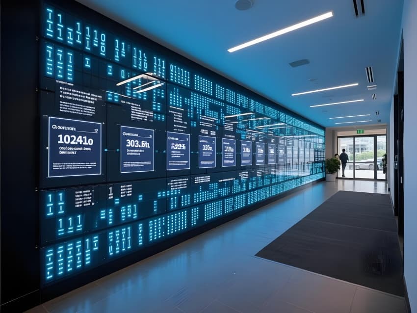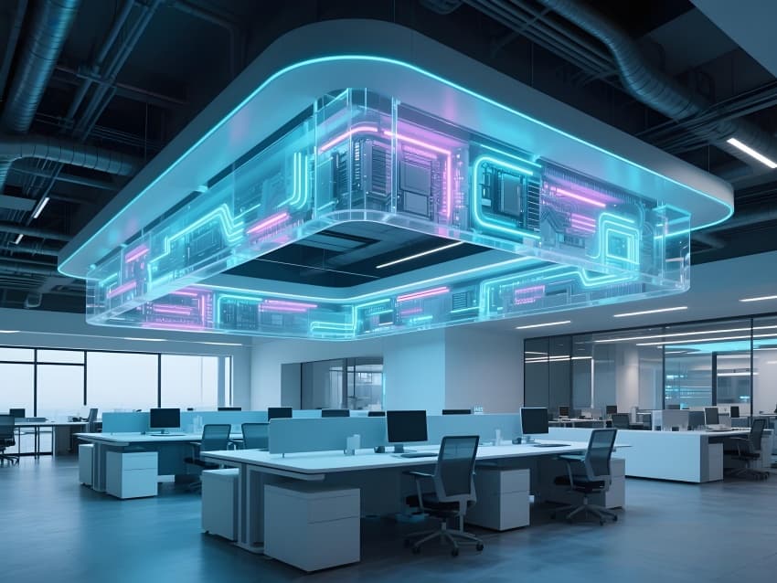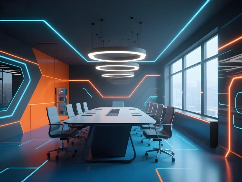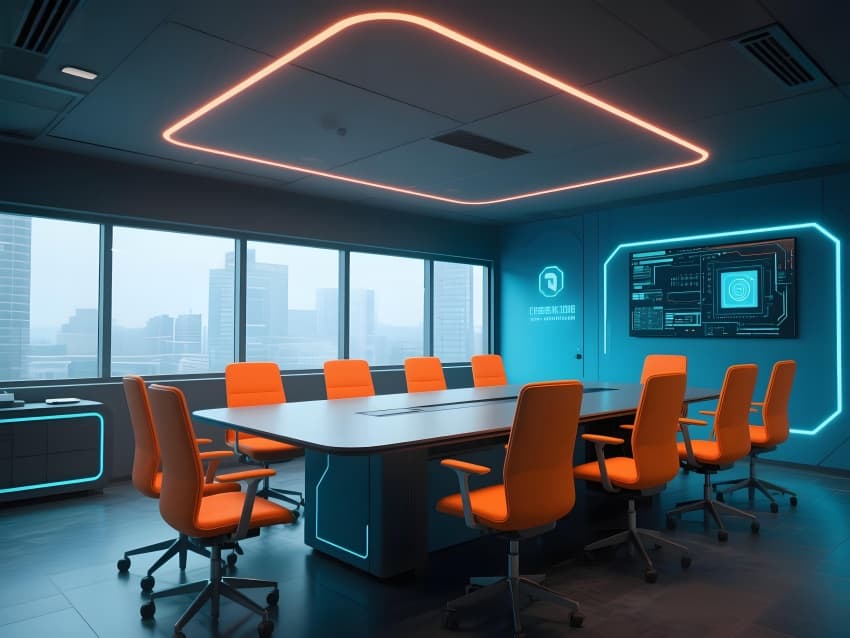 本案以"代碼可視化"為概念,打造數(shù)字原住民的工作烏托邦。入口處10米長(zhǎng)的二進(jìn)制藝術(shù)墻由可觸控LED模塊組成,滑動(dòng)即顯示公司里程碑事件。開(kāi)放式辦公區(qū)采用懸浮式工作站設(shè)計(jì),頭頂管線層以透明亞克力包裹并內(nèi)置RGB氛圍燈,模仿計(jì)算機(jī)內(nèi)部結(jié)構(gòu)美學(xué)。中央樞紐區(qū)設(shè)置環(huán)形數(shù)字瀑布屏,實(shí)時(shí)滾動(dòng)全球分支機(jī)構(gòu)的開(kāi)發(fā)數(shù)據(jù)。極簡(jiǎn)主義的混凝土立柱表面蝕刻Python/Java等代碼片段,而休息區(qū)則通過(guò)暖木色階梯書架和苔蘚墻平衡科技冰冷感。聲學(xué)吊頂模擬WiFi信號(hào)波動(dòng)曲線,智能玻璃窗隨PM2.5數(shù)值自動(dòng)開(kāi)啟新風(fēng)系統(tǒng),實(shí)現(xiàn)科技美學(xué)與人體工學(xué)的深度耦合。
