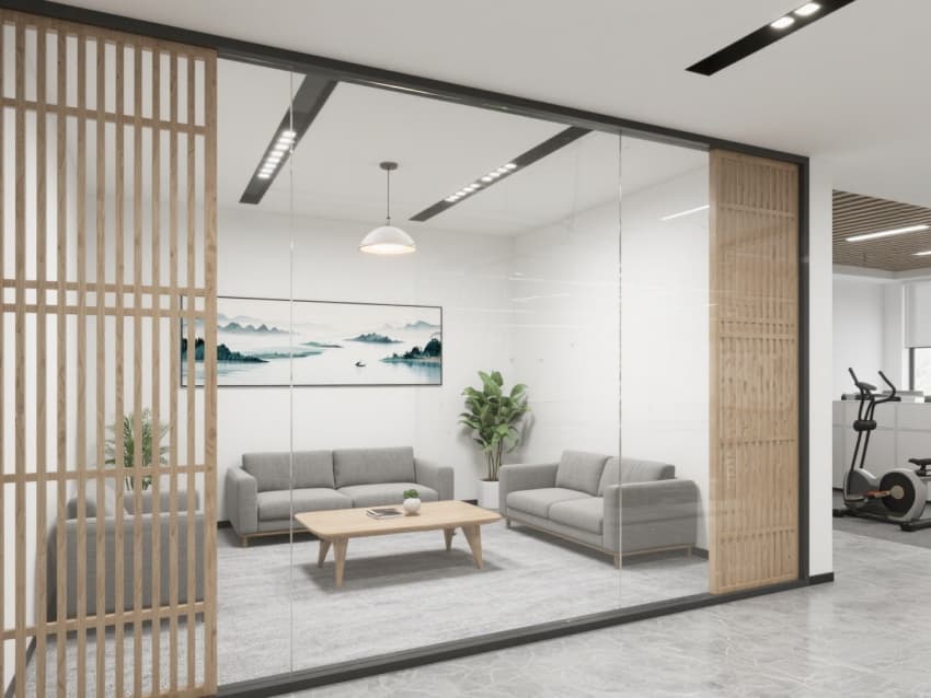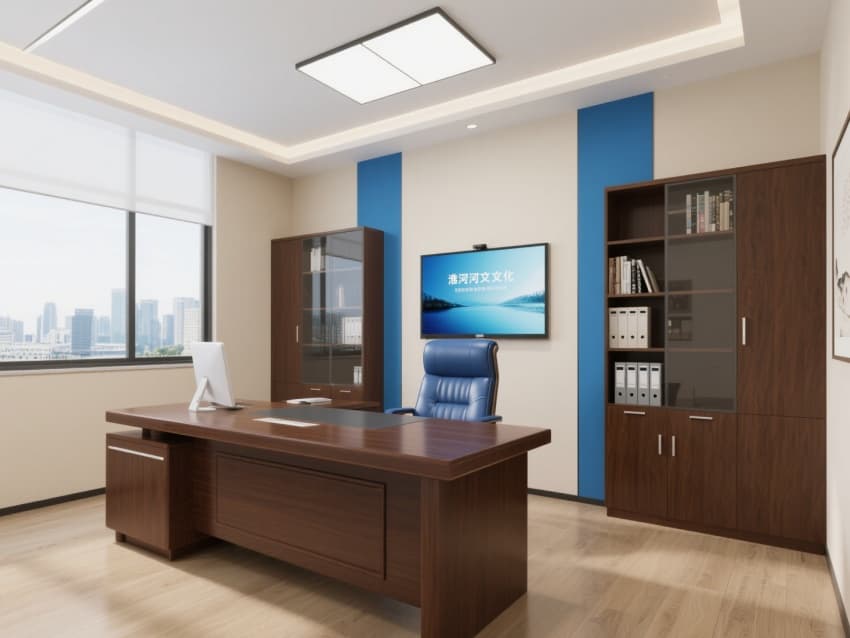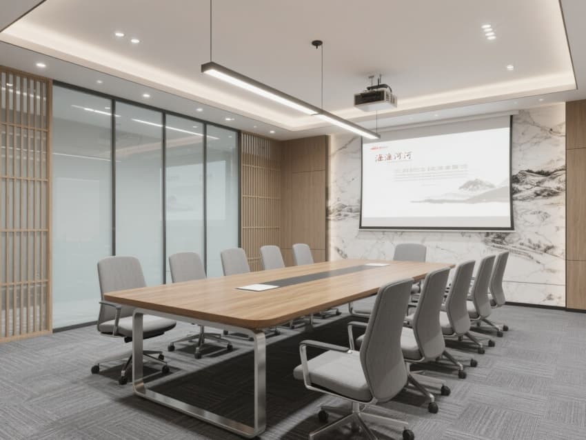 一層接待區(qū)設(shè)青藍(lán)色漸變玻璃屏風(fēng),嵌簡化的淮河浪花紋樣;二層辦公區(qū)用淺木色模塊工位,天花懸仿淮河波光的線性燈;三層會(huì)議室墻面覆仿河砂肌理涂料,配實(shí)木會(huì)議桌,角落擺蚌埠珍珠元素裝飾擺件。