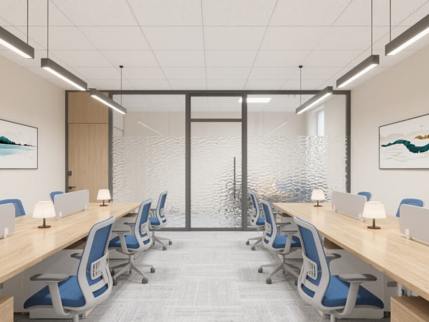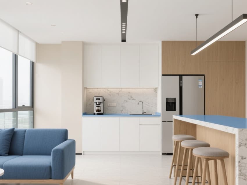 各區(qū)域以青藍(lán)色金屬收邊與淺木元素串聯(lián),茶水間用印淮河古渡口紋樣的瓷磚,走廊掛水墨風(fēng)格蚌埠龍子湖、涂山地標(biāo)裝飾畫。既滿足現(xiàn)代辦公功能,又借淮河文化元素凸顯地域?qū)傩?,打造有文化記憶點(diǎn)的蚌埠企業(yè)辦公場景。