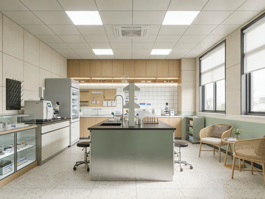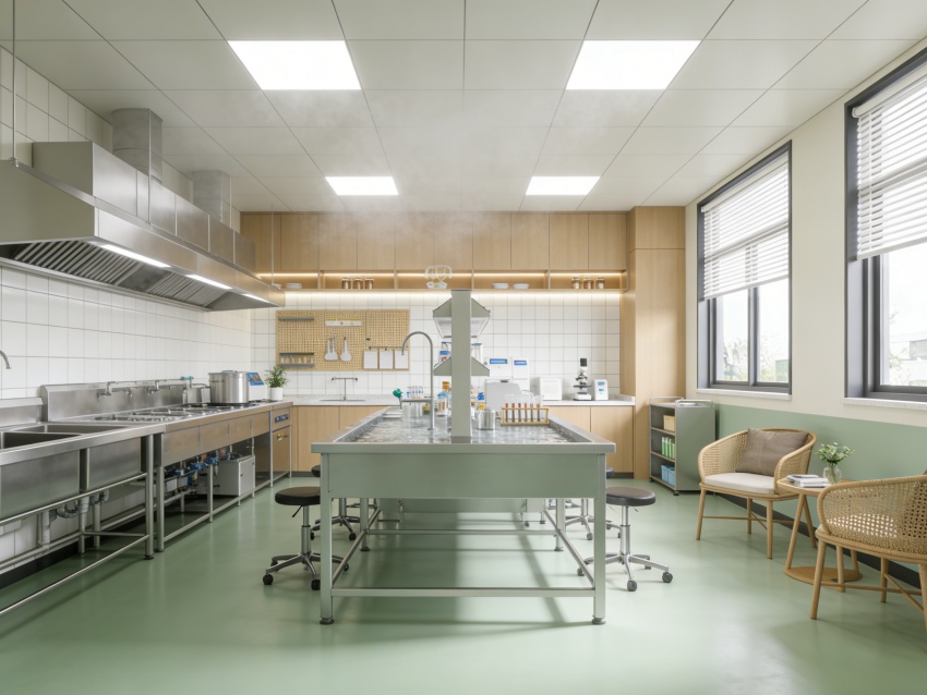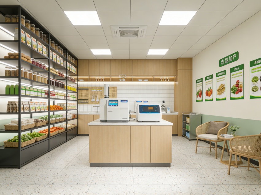 整體以淺灰、米白為基調(diào),搭配局部淺綠點綴,呼應(yīng)農(nóng)產(chǎn)品自然屬性。材質(zhì)選用食品級不銹鋼、耐磨耐污工業(yè)板材及防滑地磚,符合衛(wèi)生規(guī)范與生產(chǎn)耐磨需求。墻面簡潔平整,局部設(shè)置標(biāo)識牌引導(dǎo)動線,燈光采用均勻漫射設(shè)計,保障生產(chǎn)與檢測照明充足。各空間通過密封隔斷與專用廊道銜接,既保障生產(chǎn)流程有序,又強化衛(wèi)生防護(hù),實現(xiàn)實用功能與統(tǒng)一風(fēng)格的深度融合。