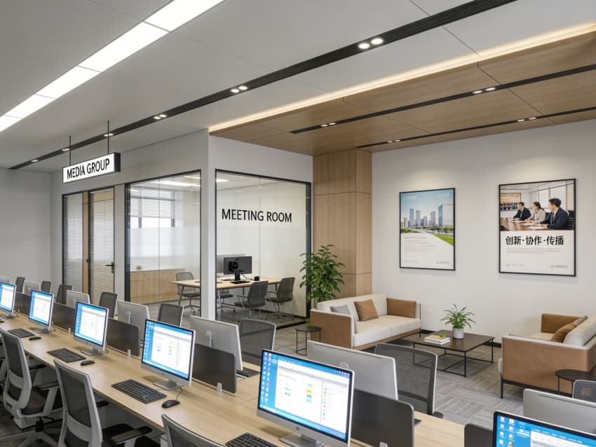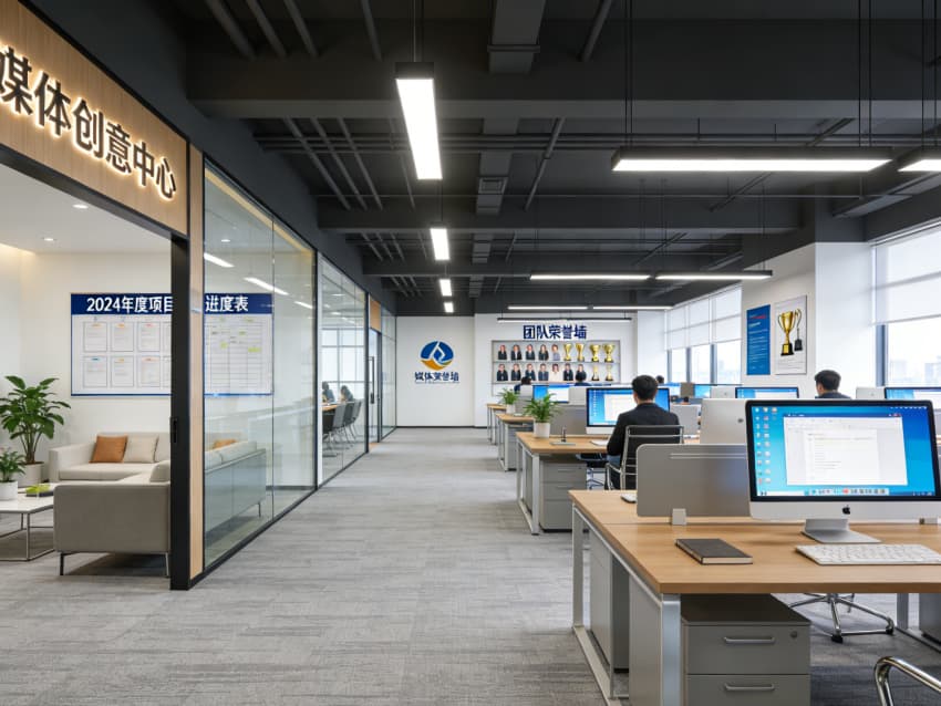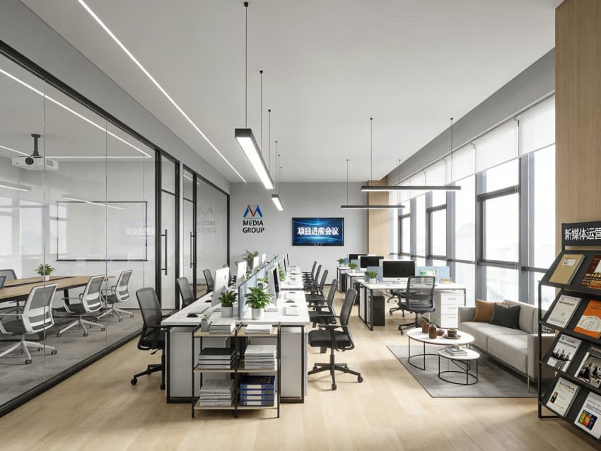 • 本設(shè)計(jì)以 「創(chuàng)意驅(qū)動(dòng),協(xié)作共生」為核心,為內(nèi)容生產(chǎn)型媒體團(tuán)隊(duì)打造了兼具專業(yè)質(zhì)感與活力氛圍的復(fù)合辦公空間,深度適配媒體行業(yè) “高頻協(xié)作、靈感迸發(fā)、靈活迭代” 的核心需求,既保障內(nèi)容生產(chǎn)的高效運(yùn)轉(zhuǎn),又通過場景化設(shè)計(jì)激發(fā)團(tuán)隊(duì)創(chuàng)造力。