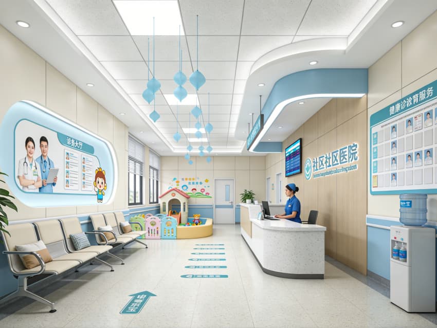 本社區(qū)醫(yī)院內(nèi)部以“溫馨便民·專業(yè)規(guī)范”為核心設(shè)計理念,整體采用柔和親切的現(xiàn)代醫(yī)療風(fēng)格,精準(zhǔn)適配全科診療、預(yù)防接種、健康宣教等社區(qū)醫(yī)療核心需求。設(shè)計弱化傳統(tǒng)醫(yī)院的冰冷感,通過溫潤色調(diào)與人性化布局,打造讓居民倍感安心的近距離醫(yī)療服務(wù)空間。