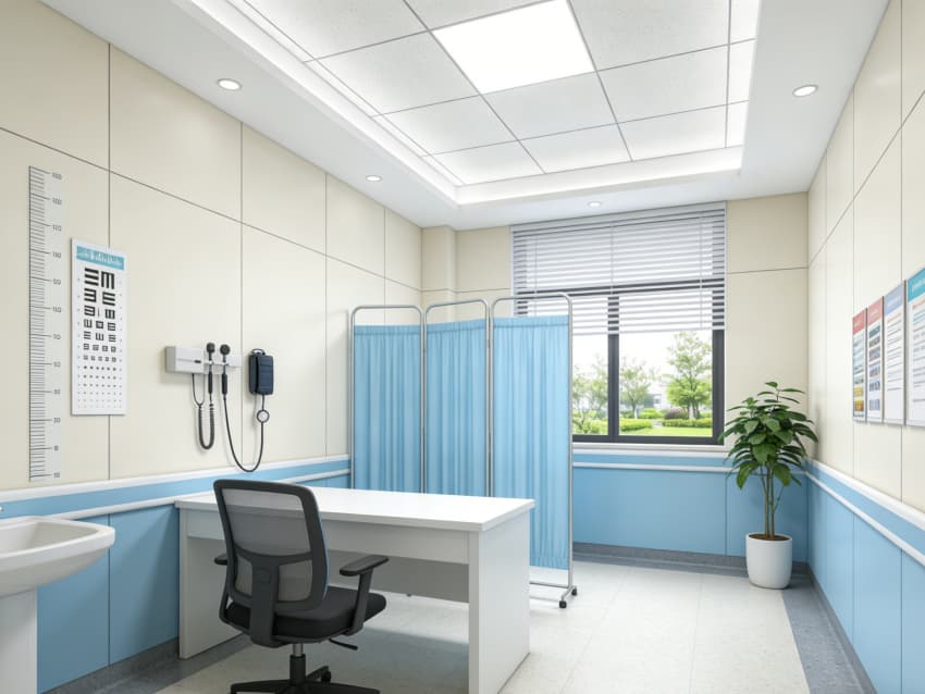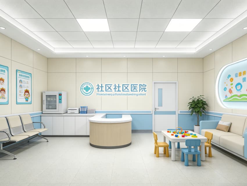 整體以淺米白、淡藍(lán)為基調(diào),搭配原木色軟裝增添暖意,材質(zhì)選用環(huán)保耐磨板材、防滑抗菌地磚及圓角防護(hù)材質(zhì)。墻面設(shè)置清晰的導(dǎo)診標(biāo)識與健康科普海報,燈光采用柔和漫射照明。各區(qū)域動線簡潔流暢,掛號、診療、取藥流程銜接順暢,既保障醫(yī)療服務(wù)的專業(yè)性與規(guī)范性,又以溫馨細(xì)節(jié)傳遞人文關(guān)懷,讓社區(qū)居民享受便捷安心的醫(yī)療服務(wù)。