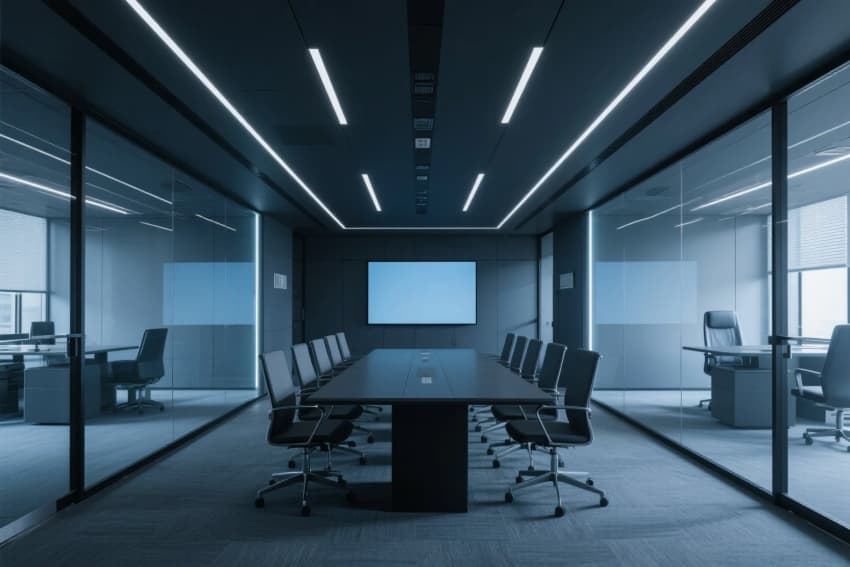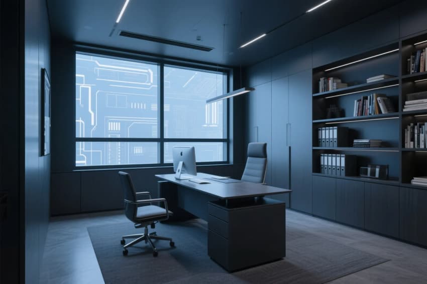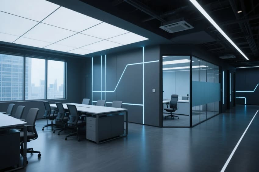•   本案定位“高效·人文·科技”,以現(xiàn)代簡約為基底,融合工業(yè)風質(zhì)感與企業(yè)品牌調(diào)性??臻g采用開放與私密結(jié)合的布局,主色調(diào)以中性灰、原木色、企業(yè)標志色構(gòu)成,材質(zhì)上強調(diào)啞光金屬、玻璃隔斷、環(huán)保木飾面的碰撞,提升專業(yè)度與溫度感。
