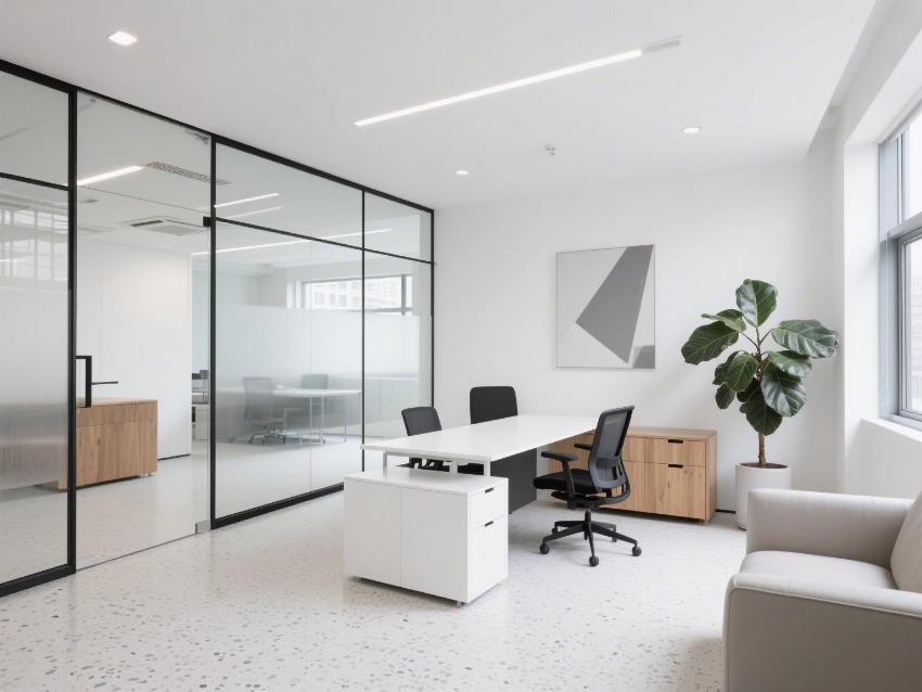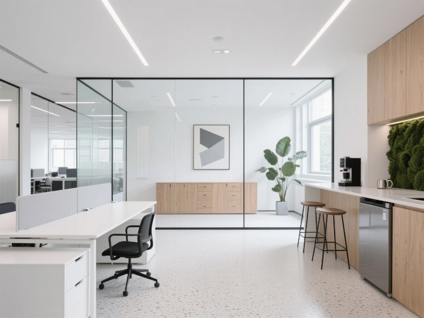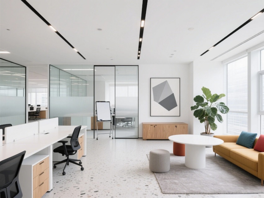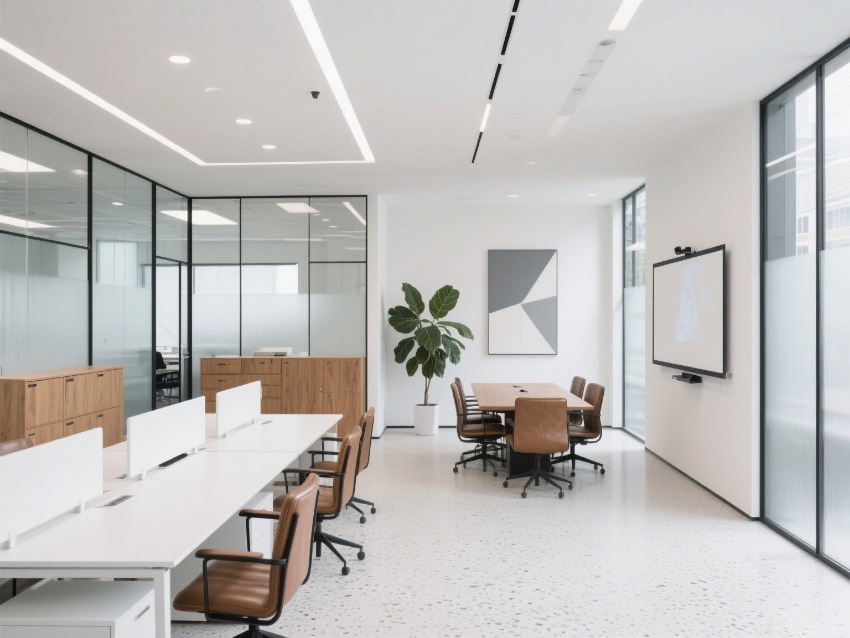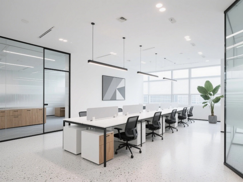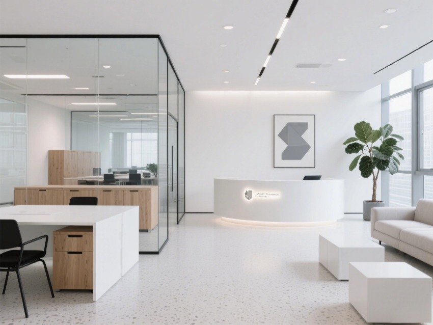 •     該案例以現(xiàn)代極簡風(fēng)格為核心,呈現(xiàn)出高度統(tǒng)一的視覺語言。整體以淺灰、米白為基調(diào),搭配原木色與低飽和藍(lán)作為點(diǎn)綴,營造出簡潔通透的氛圍??臻g布局強(qiáng)調(diào)開放式架構(gòu),減少冗余隔斷,通過高低錯(cuò)落的綠植墻與半通透屏風(fēng)劃分功能區(qū)。家具選用線條利落的模塊化組合,金屬細(xì)框辦公桌與布藝沙發(fā)形成材質(zhì)碰撞。燈光采用無主燈設(shè)計(jì),磁吸軌道燈與嵌入式筒燈提供均勻照明,玻璃幕墻引入充足自然光,讓每個(gè)角落都透著簡約而不失精致的專業(yè)感。