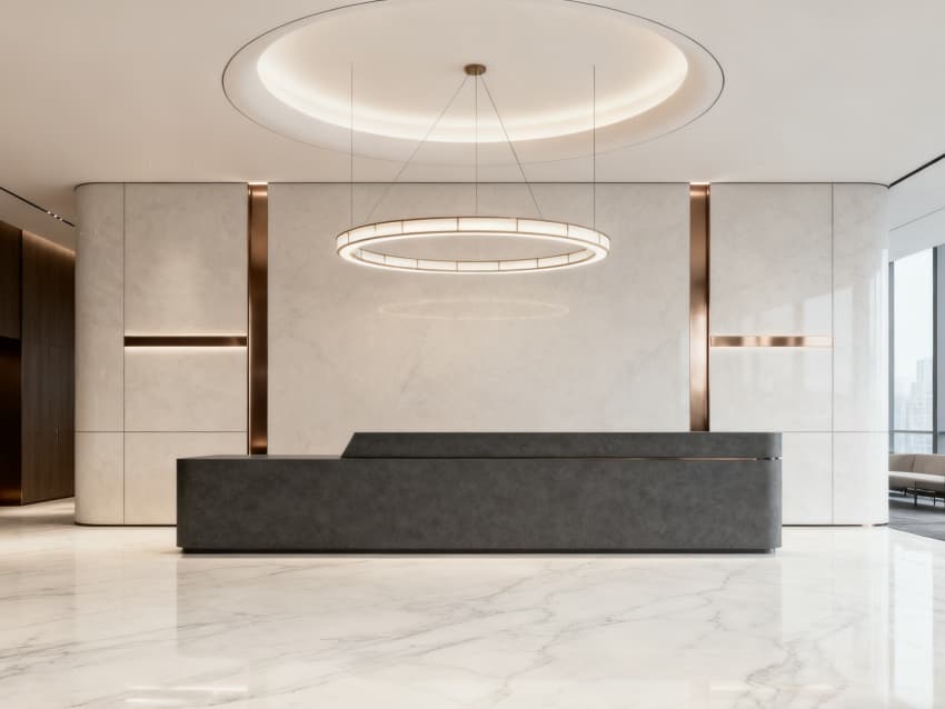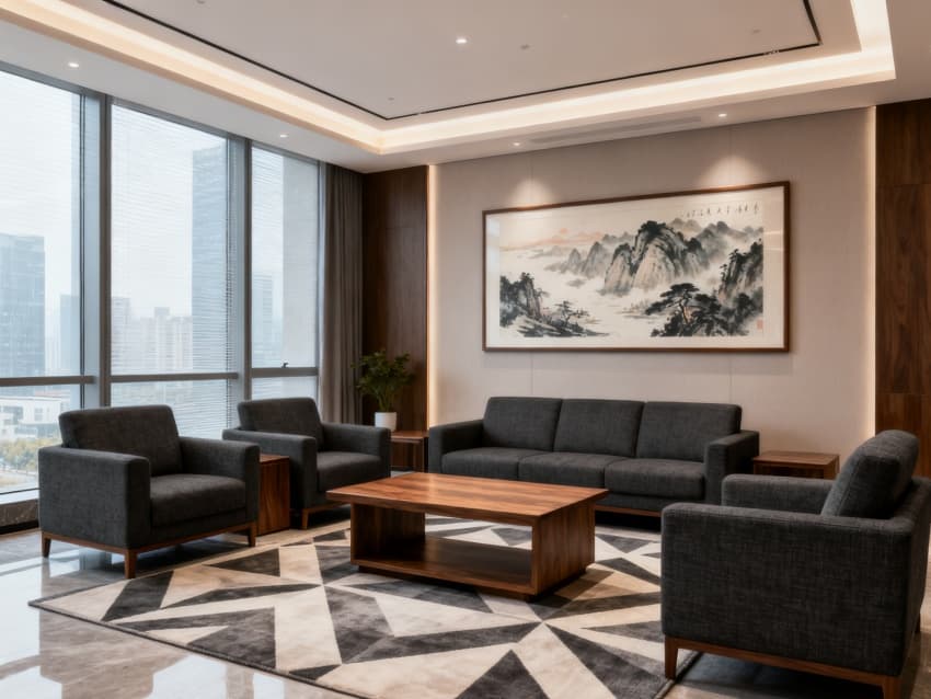 內(nèi)部空間延續(xù)外立面的商務(wù)質(zhì)感:辦公區(qū)用淺灰地毯搭配深棕實(shí)木辦公桌,白色文件柜簡(jiǎn)潔規(guī)整;會(huì)議室以深灰軟包墻面搭配淺木色會(huì)議桌,嵌入式筒燈營(yíng)造專注氛圍;接待區(qū)用米白真皮沙發(fā)搭配深灰茶幾,金屬擺件提升精致度;走廊采用淺灰地磚與白色墻面,深灰金屬扶手增強(qiáng)層次感;茶水間以淺灰柜體搭配白色石英石臺(tái)面,嵌入式電器節(jié)省空間。整體通過(guò)統(tǒng)一的色彩與材質(zhì),打造出專業(yè)且舒適的商務(wù)辦公環(huán)境。