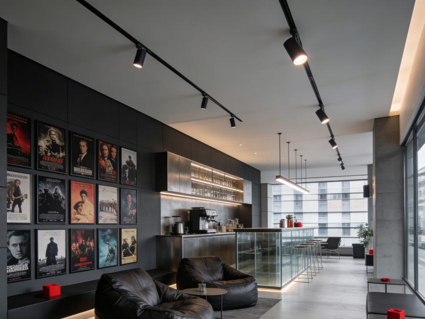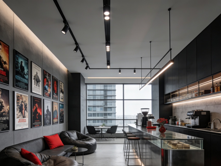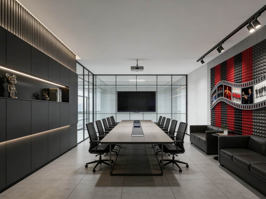 內部功能分區(qū)清晰合理,涵蓋剪輯工作站、小型拍攝棚、創(chuàng)意研討區(qū)、素材檔案室、客戶接待區(qū)及員工休閑區(qū)。剪輯工作站采用模塊化布局,配備專業(yè)設備支架與隱藏式布線,保障操作便捷;拍攝棚以純色背景墻搭配可調節(jié)燈光系統(tǒng),適配小型場景拍攝;研討區(qū)設置靈活組合桌椅,搭配高清投屏,助力團隊頭腦風暴;檔案室采用密閉式收納與通透展示結合,兼顧素材保管與查閱效率。