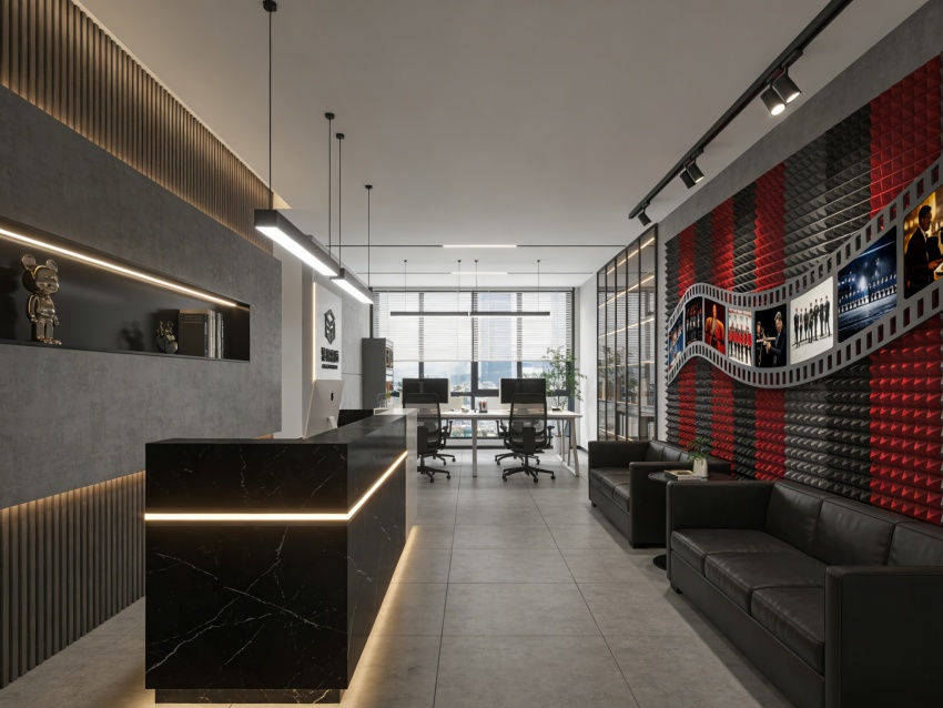 • 本影視制作公司內部以“簡約高效·創(chuàng)意賦能”為核心,精準適配劇本創(chuàng)作、剪輯后期、拍攝籌備等全流程需求。設計摒棄冗余裝飾,以簡潔線條、通透布局釋放空間張力,為創(chuàng)作團隊營造專注且富有靈感的工作氛圍。