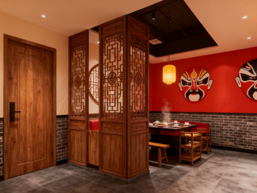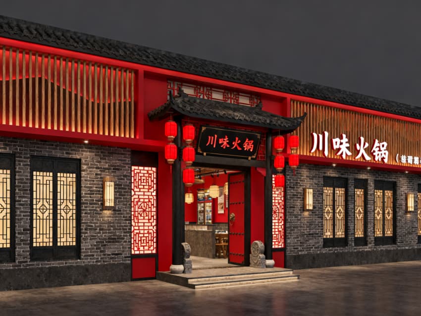 • 本1200㎡川味火鍋店主打“新派川韻·煙火共生”設(shè)計(jì)理念,實(shí)現(xiàn)外立面與內(nèi)部空間風(fēng)格統(tǒng)一,既延續(xù)川渝傳統(tǒng)煙火氣,又融入現(xiàn)代舒適體驗(yàn)。外立面以紅棕為主色調(diào),搭配青灰色仿磚肌理與木質(zhì)格柵,嵌入復(fù)古燈籠與川劇臉譜元素,直觀傳遞川味內(nèi)核,門頭開放式設(shè)計(jì)增強(qiáng)通透感,吸引食客駐足。