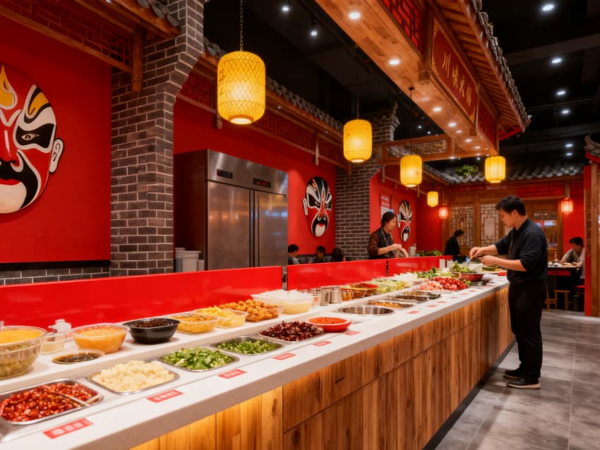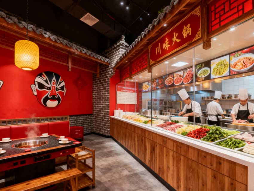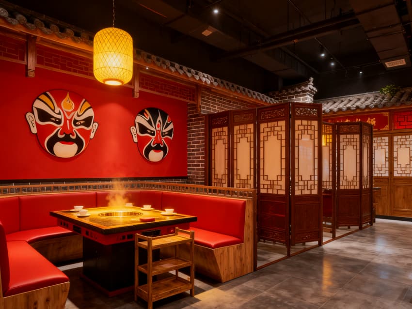 整體以紅、棕、青灰為主色調(diào),呼應(yīng)川渝市井風(fēng)情與火鍋熱辣特質(zhì)。材質(zhì)上選用耐磨防滑的仿古磚、溫潤的實(shí)木桌椅,墻面點(diǎn)綴手繪川渝街巷壁畫與辣椒、花椒等元素裝飾。燈光設(shè)計(jì)兼顧實(shí)用與氛圍,餐臺(tái)吊燈聚焦用餐區(qū)域,吊頂隱藏式燈帶營造暖調(diào)氛圍。1200㎡空間動(dòng)線流暢,各區(qū)域銜接自然,既還原川渝火鍋的煙火氣息,又通過現(xiàn)代設(shè)計(jì)手法提升用餐舒適度,實(shí)現(xiàn)傳統(tǒng)風(fēng)味與當(dāng)代審美的平衡。