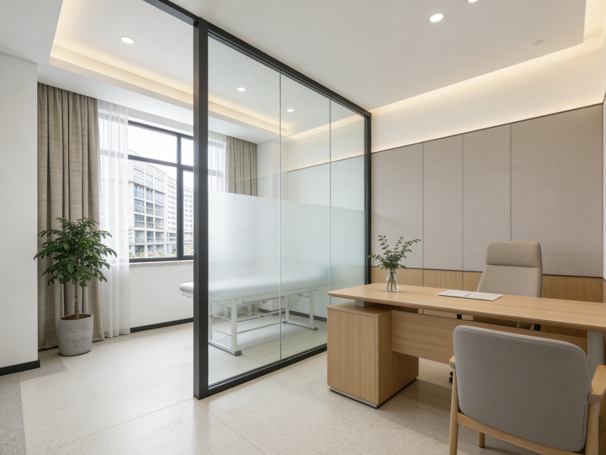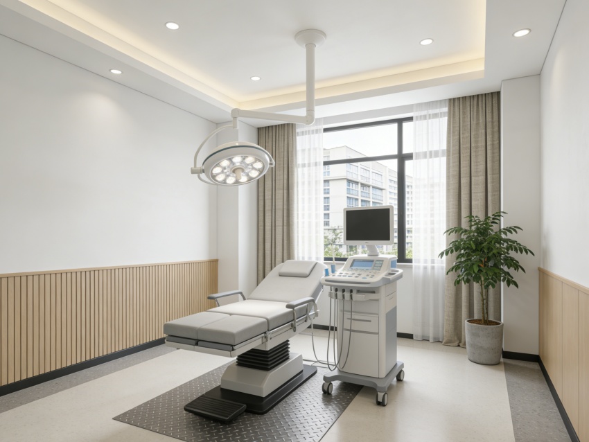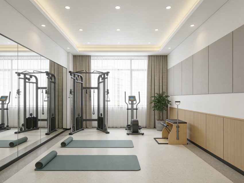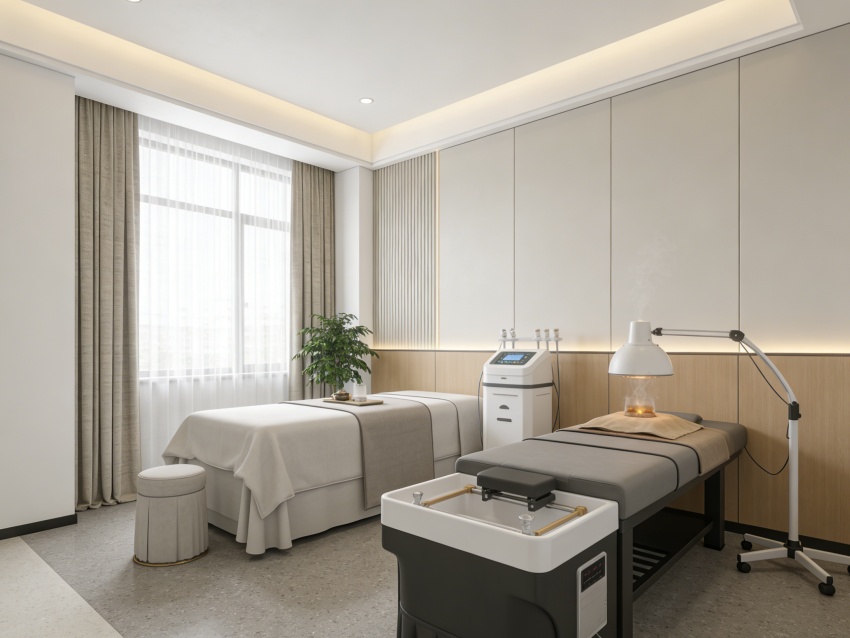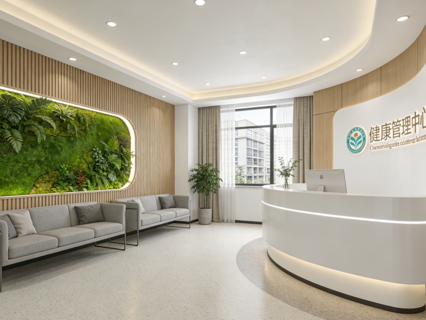 整體以淺米白、淡綠為基調(diào),搭配原木色與淺灰色,材質(zhì)選用環(huán)??咕尼t(yī)用級板材、防滑耐磨地磚及柔軟布藝,兼顧實(shí)用性與健康需求。墻面留白為主,局部點(diǎn)綴健康理念標(biāo)語或簡約裝飾畫,燈光采用暖調(diào)漫射設(shè)計(jì),避免強(qiáng)光刺激。各空間通過簡潔廊道與通透隔斷自然銜接,動(dòng)線貼合健康服務(wù)流程,既保障服務(wù)效率,又通過細(xì)節(jié)設(shè)計(jì)傳遞治愈感,實(shí)現(xiàn)專業(yè)功能與舒適體驗(yàn)的深度融合。