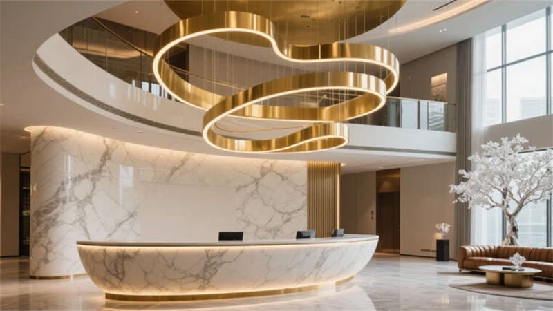 外觀設(shè)計以玻璃幕墻與天然石材的幾何拼接為視覺焦點(diǎn),日景通過景觀水池倒映建筑輪廓,夜晚則依托泛光照明凸顯立體層次,與城市天際線和諧共生。挑空兩層的大堂以金色流線吊燈與懸浮水晶樹藝術(shù)裝置為核心,大理石地面與弧形LED背光接待臺營造沉浸式抵達(dá)體驗,自然光與暖色燈光交織,傳遞低調(diào)奢華氣質(zhì)。