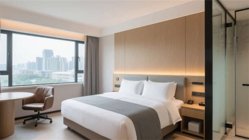 客房區(qū)域強(qiáng)調(diào)“靜謐中的科技感”,標(biāo)準(zhǔn)間通過木飾面隱藏?zé)魩c霧化玻璃衛(wèi)浴實(shí)現(xiàn)功能與美學(xué)的平衡;全景套房則以180度落地窗引入自然景觀,臨窗圓形浴缸與雙臺盆設(shè)計重新定義奢華體驗。