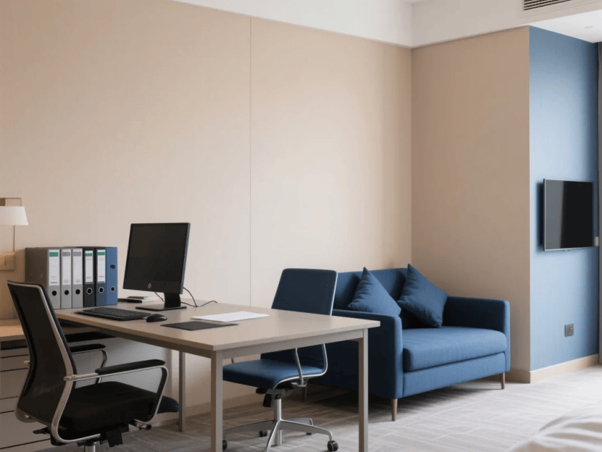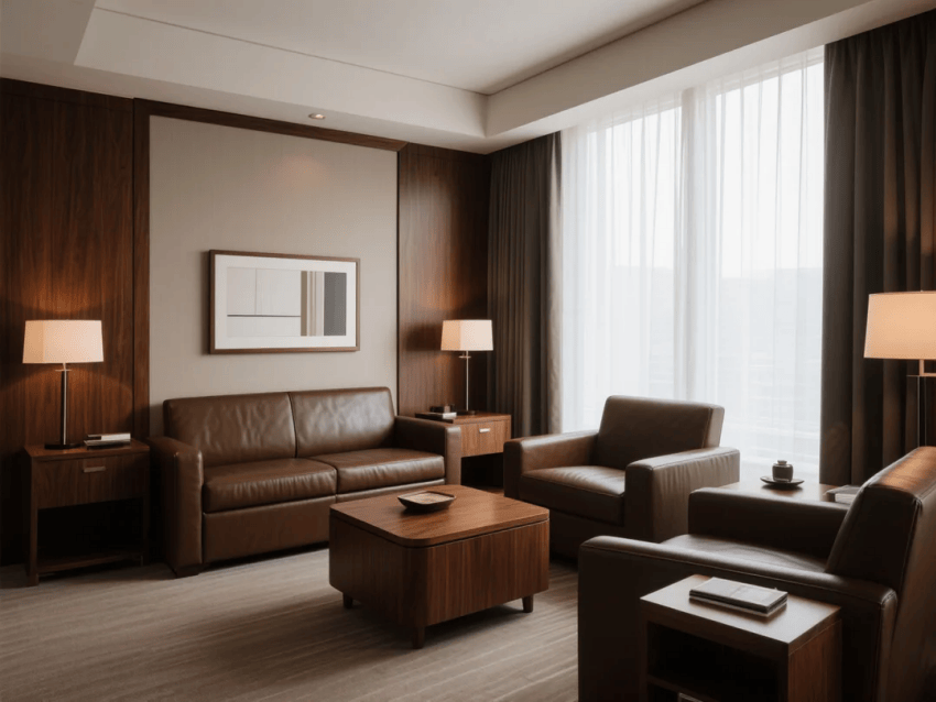 本案定位"城市商務會客廳",以現(xiàn)代簡約為基底,融入輕奢細節(jié)與智能科技??臻g采用中性色系打底,香檳金與深灰作為視覺支點,材質上選用天然木飾面、啞光金屬與高級布藝的質感組合。