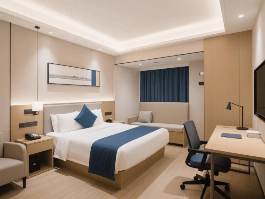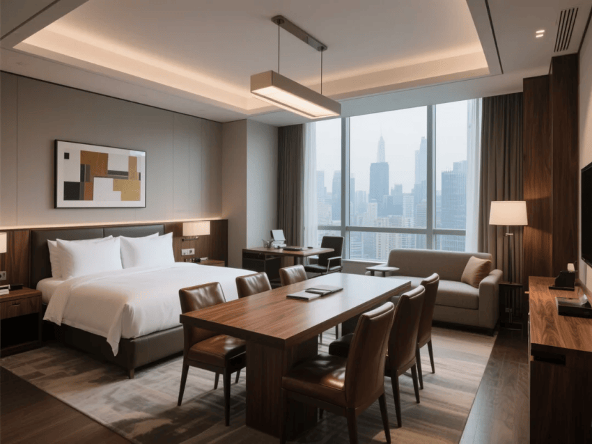功能設計突出商務效率:客房配備可變形家具系統(tǒng),會議室實現(xiàn)一鍵場景切換,公共區(qū)域植入無縫辦公生態(tài)。智能體驗貫穿始終,從無感入住到環(huán)境自適應調節(jié),在克制中彰顯品質。藝術裝置取材城市天際線,通過光影變化柔化商務空間的嚴肅感,最終打造一個高效、舒適、有格調的商務旅居空間。