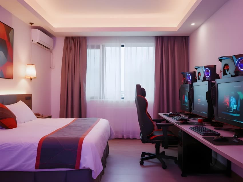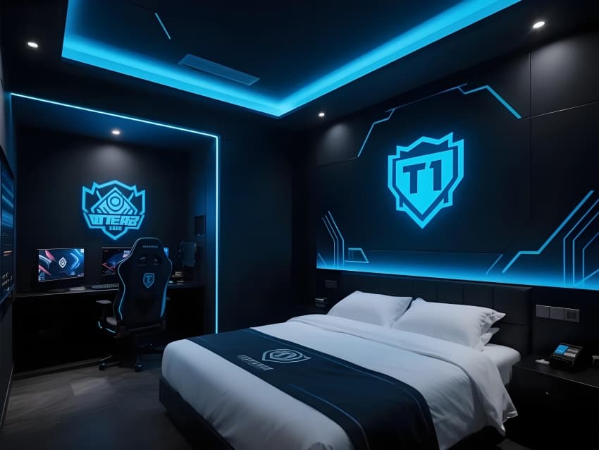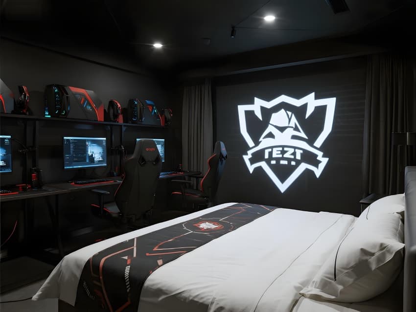 本案以"次世代電競生態(tài)圈"為設(shè)計核心,打造沉浸式數(shù)字戰(zhàn)斗堡壘??臻g采用暗黑電競美學,主色調(diào)為深淵黑基底,霓虹紫/賽博藍光刃切割空間,RGB污染指數(shù)動態(tài)調(diào)節(jié)戰(zhàn)斗氛圍。核心區(qū)域突破現(xiàn)實維度:大堂植入全息NPC接待員,客房變身職業(yè)戰(zhàn)隊基地,賽場配置液氮勝利煙花系統(tǒng)。