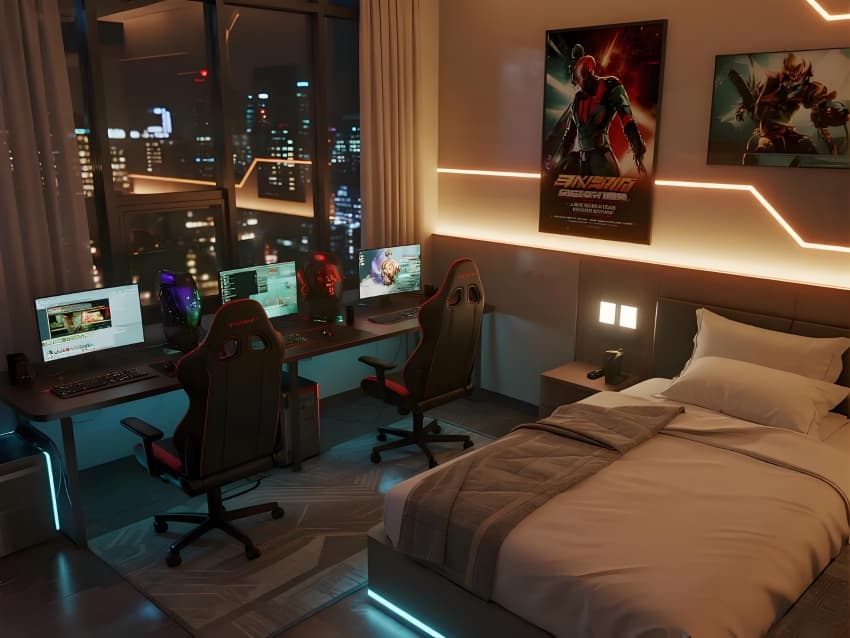 硬核裝備全面升級:240Hz刷新率環(huán)境光效,7.1聲道全域音場,體感反饋游戲地臺。材質(zhì)選用碳纖維飾面、導光亞克力、防汗金屬漆,所有設(shè)計服務(wù)于巔峰競技狀態(tài)。最終呈現(xiàn)一個既像科幻戰(zhàn)場又是玩家圣地的次世代電競烏托邦。